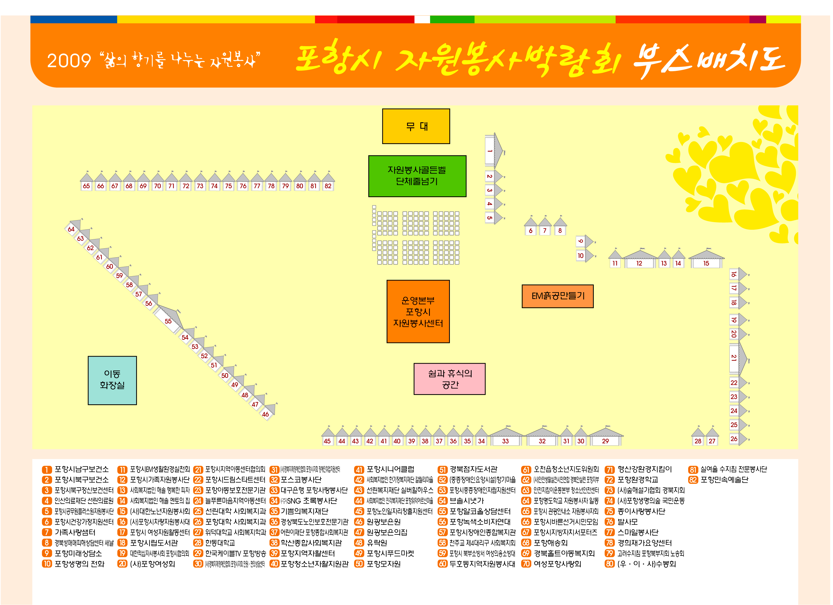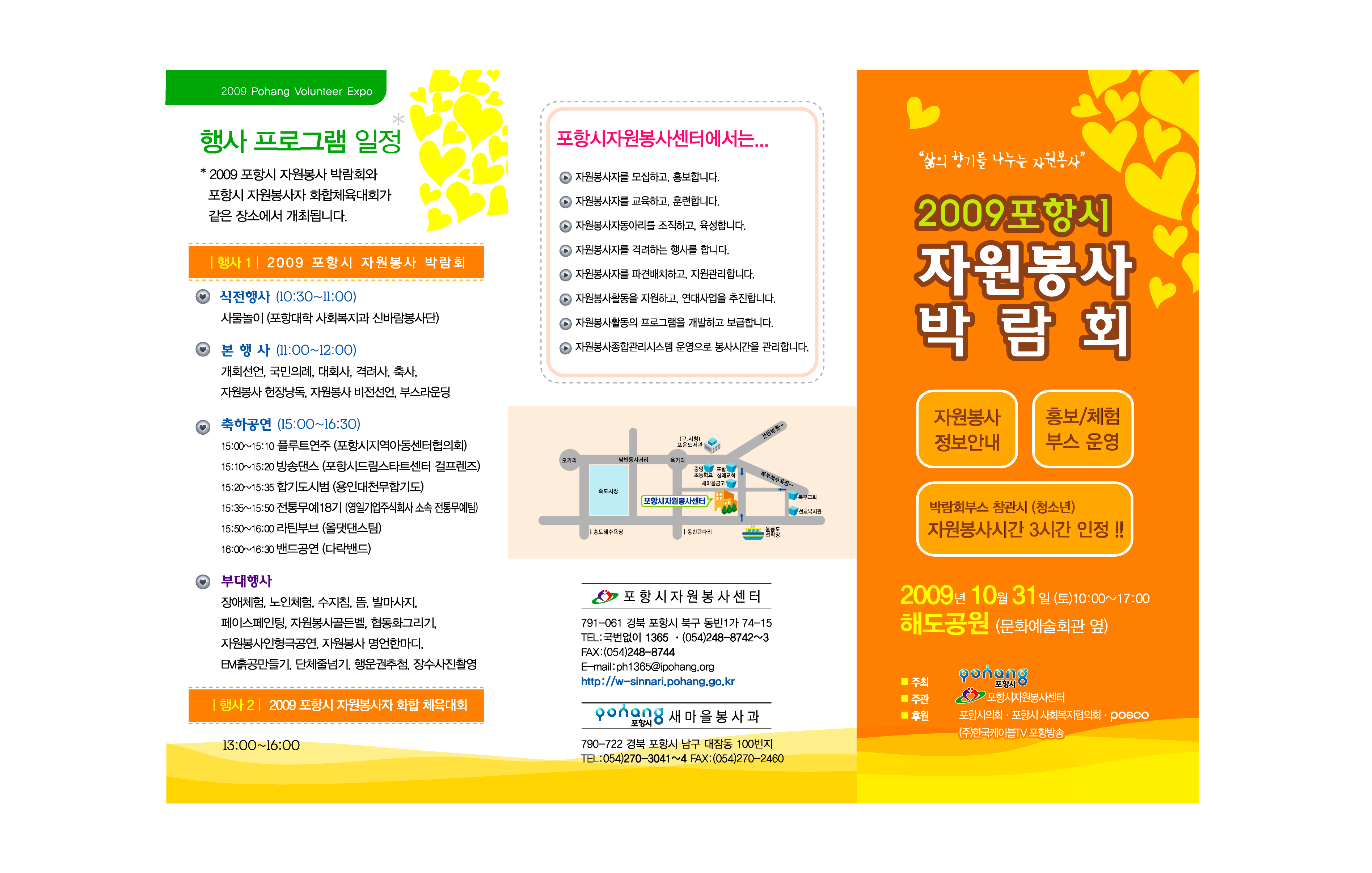10월 31일(토) 문화예술회관 옆 해도공원에서 진행되는 2009포항시자원봉사박람회 리플렛자료입니다. 첨부된 파일에 부스 위치도도 있으니 신청 기관에서는 확인해 보시면 감사하겠습니다~! |