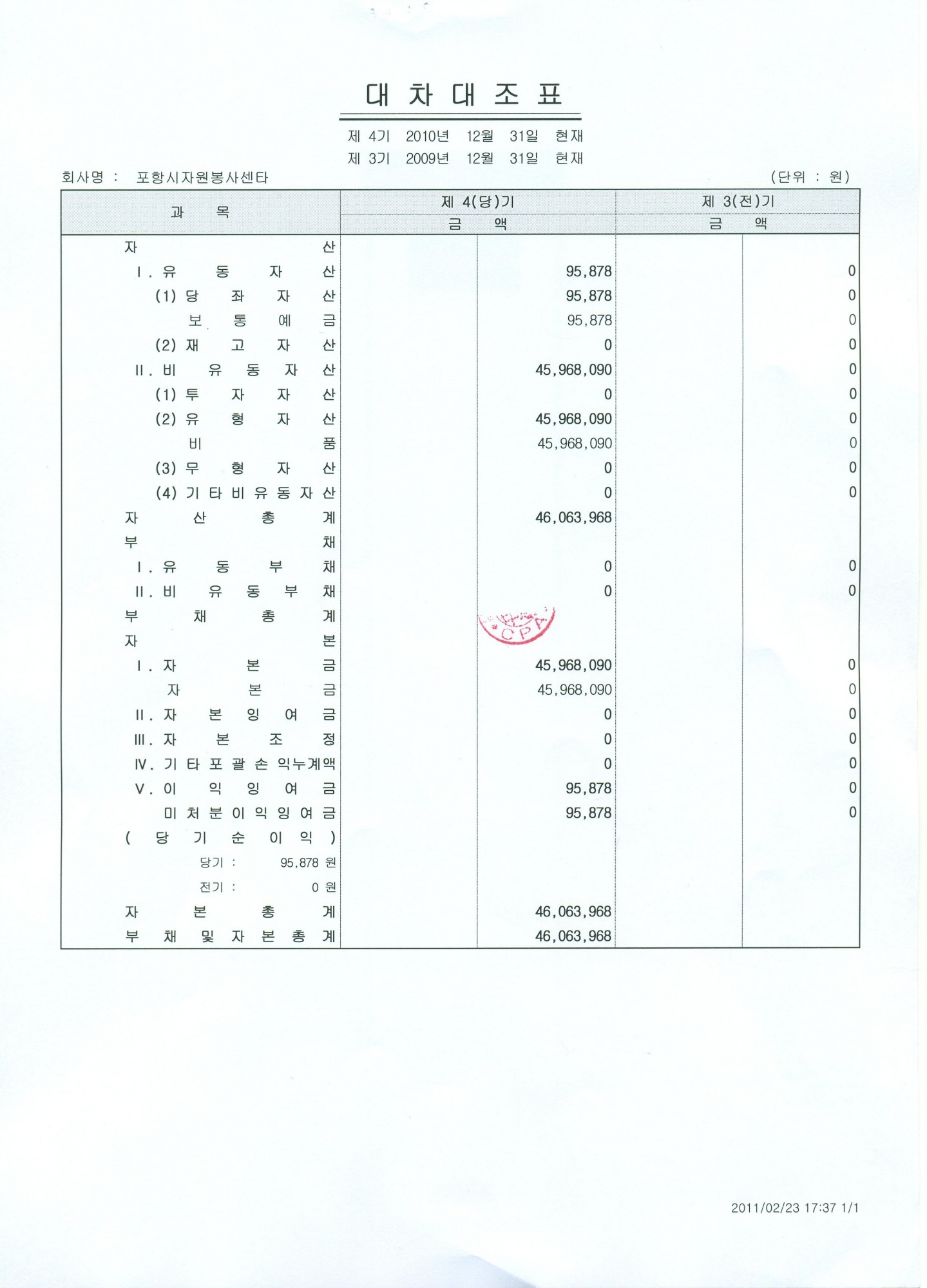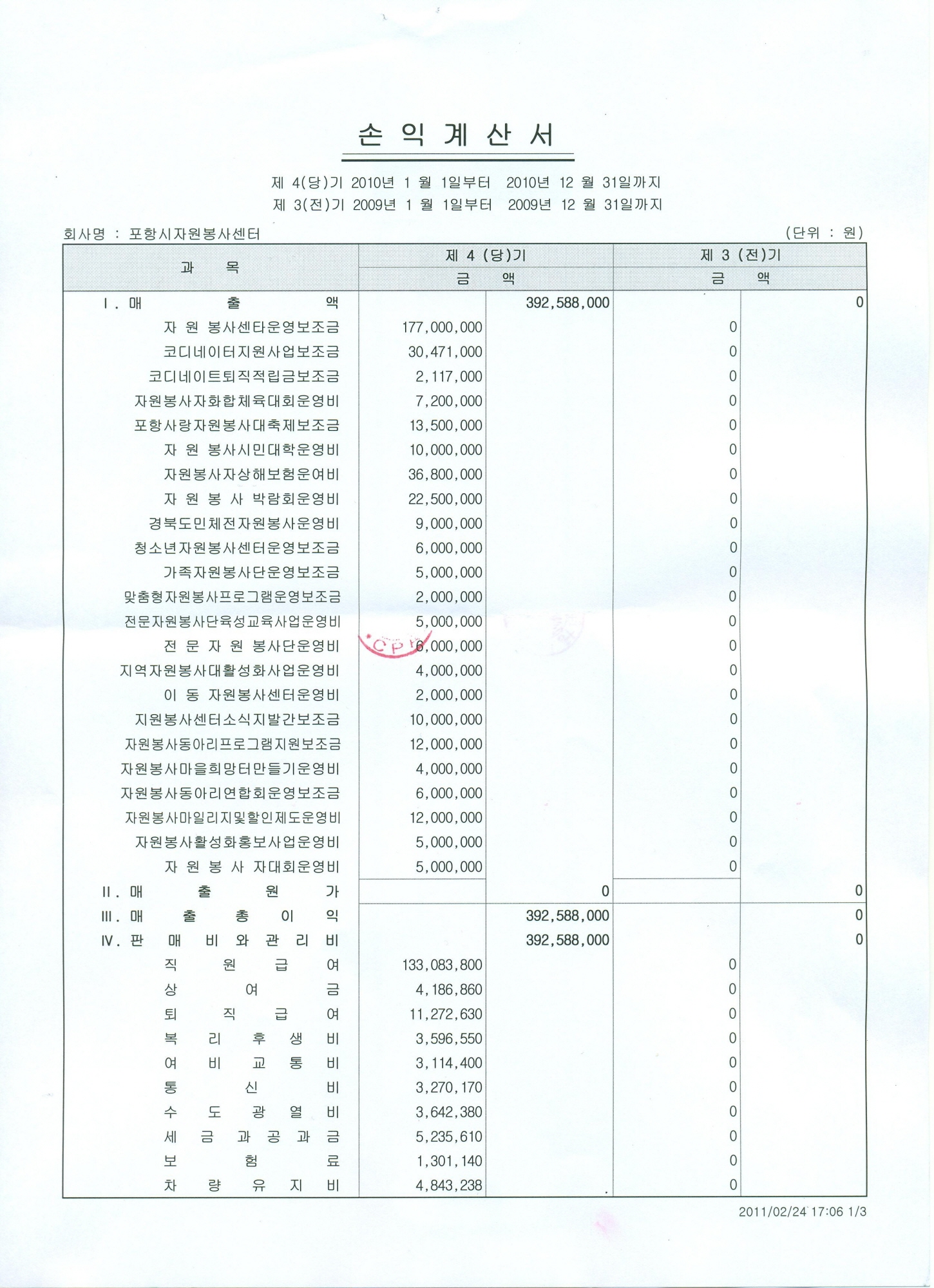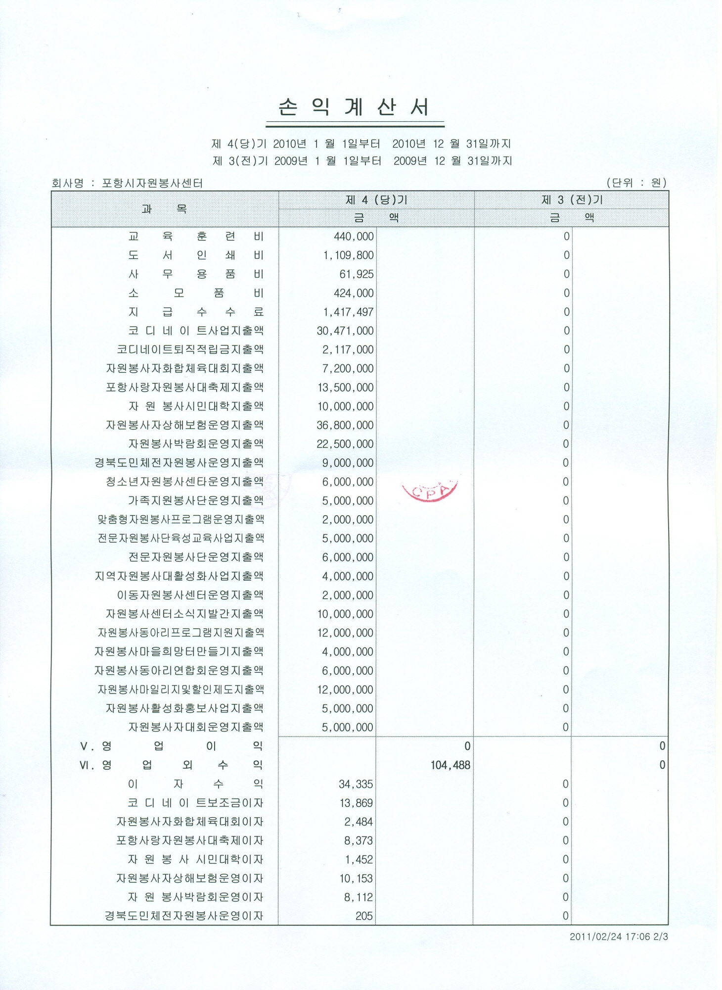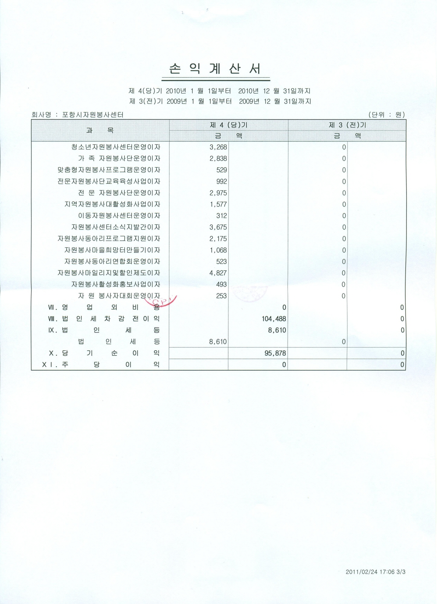 포항시자원봉사활동지원조례 제20조3항에 의거 수입지출결산서 및 대차대조표를 붙임과 같이 공고합니다. 2011. 2. 28 포항시자원봉사센터 소장