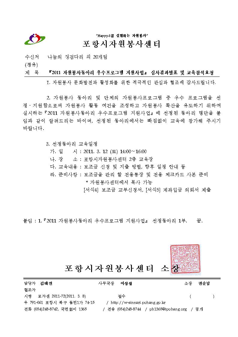 『2011 자원봉사동아리 우수프로그램 지원사업』에 선정된 동아리를 알려드리는 바이며,