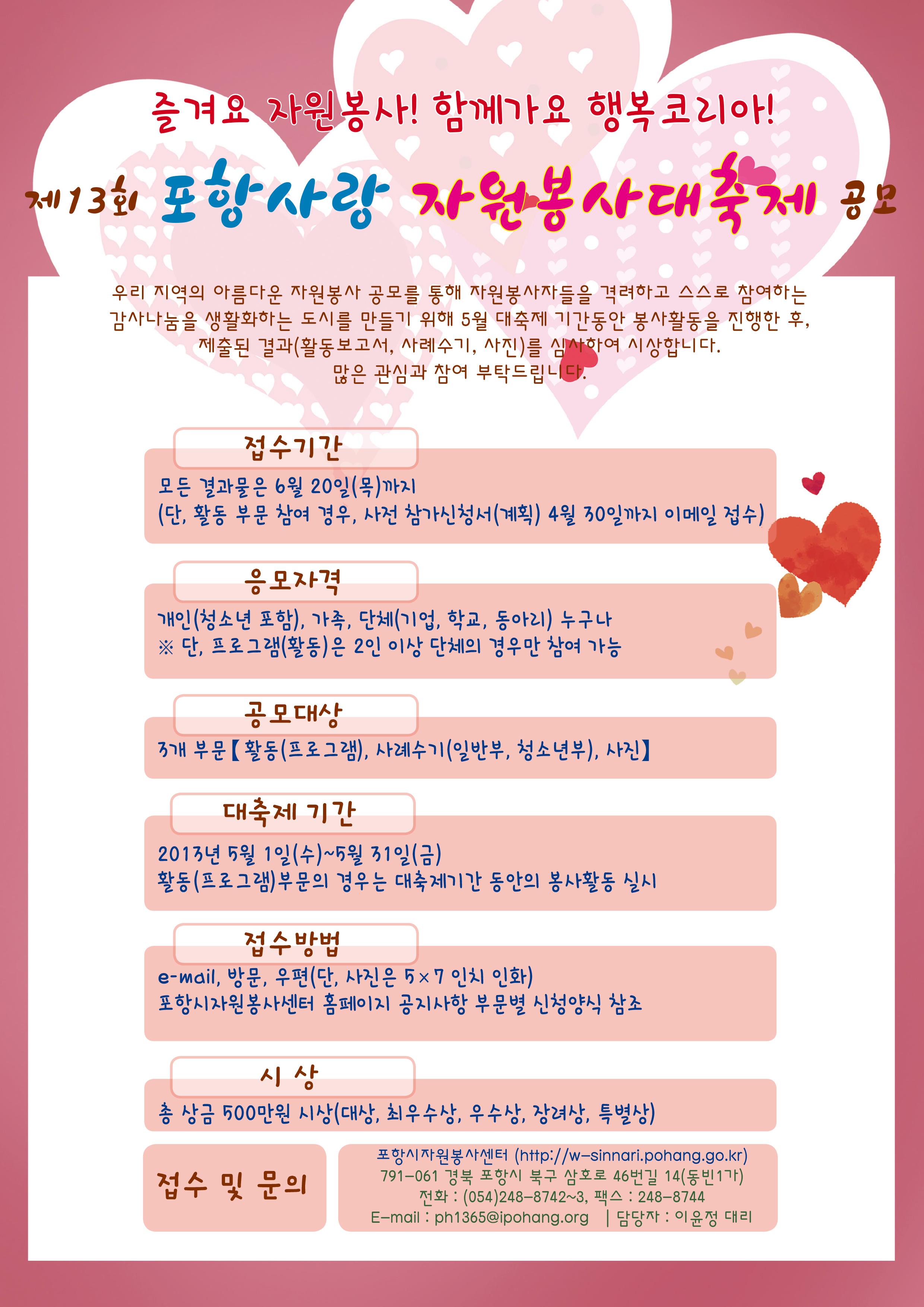 제13회 포항사랑 자원봉사대축제 공모 우리 지역의 아름다운 자원봉사 공모를 통해 자원봉사자들을 격려하고 스스로 참여하는 감사나눔을 생활화하는 도시를 만들기 위해 5월 대축제 기간동안 봉사활동을 진행한 후, 제출된 결과(활동보고서, 사례수기, 사진)를 심사하여 시상하오니 많은 관심과 참여 부탁드립니다. * 공모주제 : 즐겨요 자원봉사!함께가요 행복코리아! * 접수기간: 모든 결과물은 6월 20일(목)까지 (단, 활동 부문 참여 경우, 사전 참가신청서(계획) 4월 30일까지 이메일 접수) * 응모자격 : 개인(청소년 포함), 가족, 단체(기업, 학교, 동아리) 누구나 ※ 단, 프로그램(활동)은 2인 이상 단체의 경우만 참여 가능