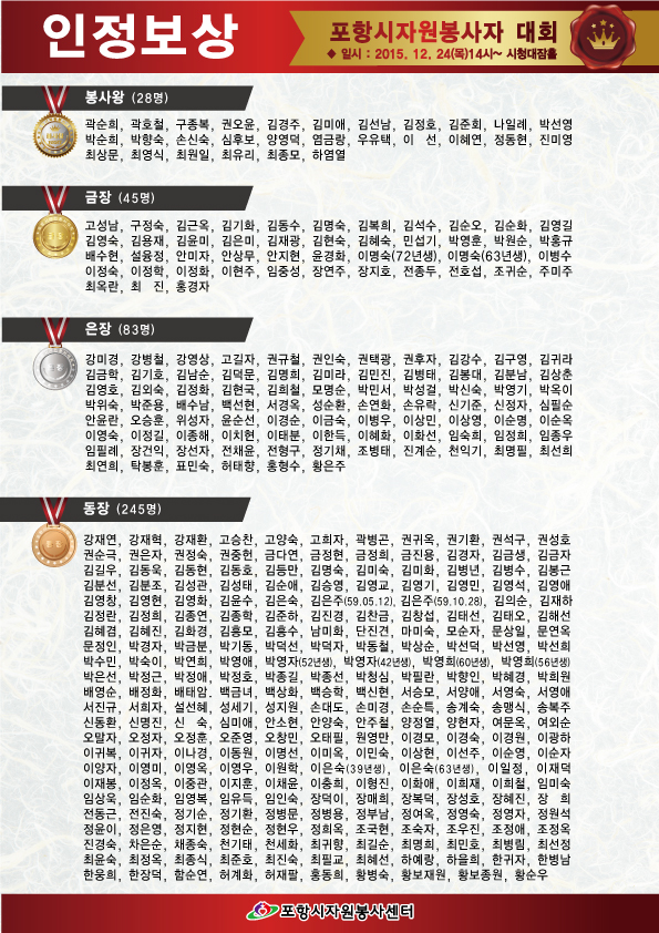 포항시자원봉사센터에서는 포항시 자원봉사활동 지원 조례 시행규칙 제26조 ②항에 의거하여, 매년 자원봉사 마일리지 우수자 선정 및 우수자원봉사자 인정·보상제도를 운영합니다. 이에 당해연도(2014.11.01~2015.10.31)동안 자원봉사활동 실적이 다음과 같이 공지합니다. |