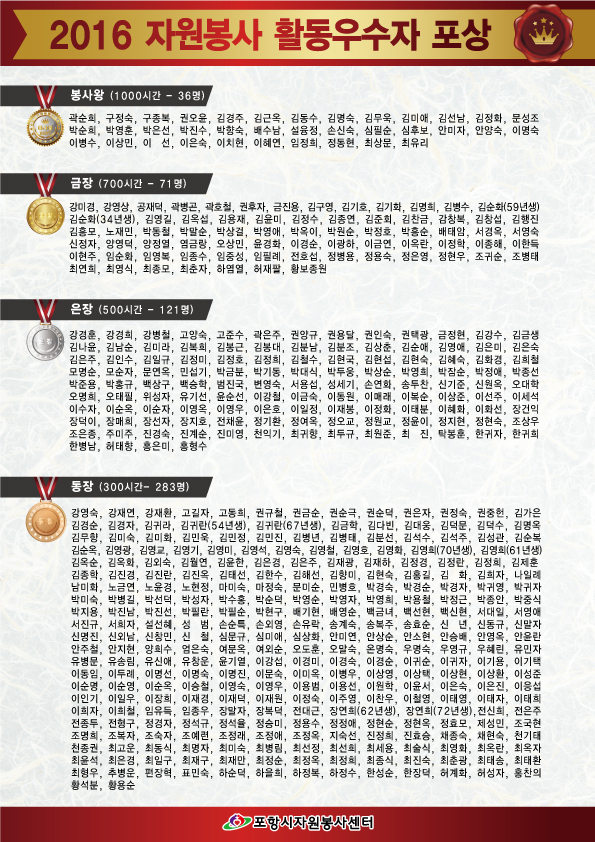 포항시자원봉사센터에서는 포항시 자원봉사활동 지원 조례 시행규칙 제26조 ②항에 의거하여, 매년 자원봉사 마일리지 우수자 선정 및 우수자원봉사자 인정·보상제도를 운영합니다. 이에 당해연도(2015.11.01~2016.10.31)동안 자원봉사활동 실적이 다음과 같이 공지합니다.
