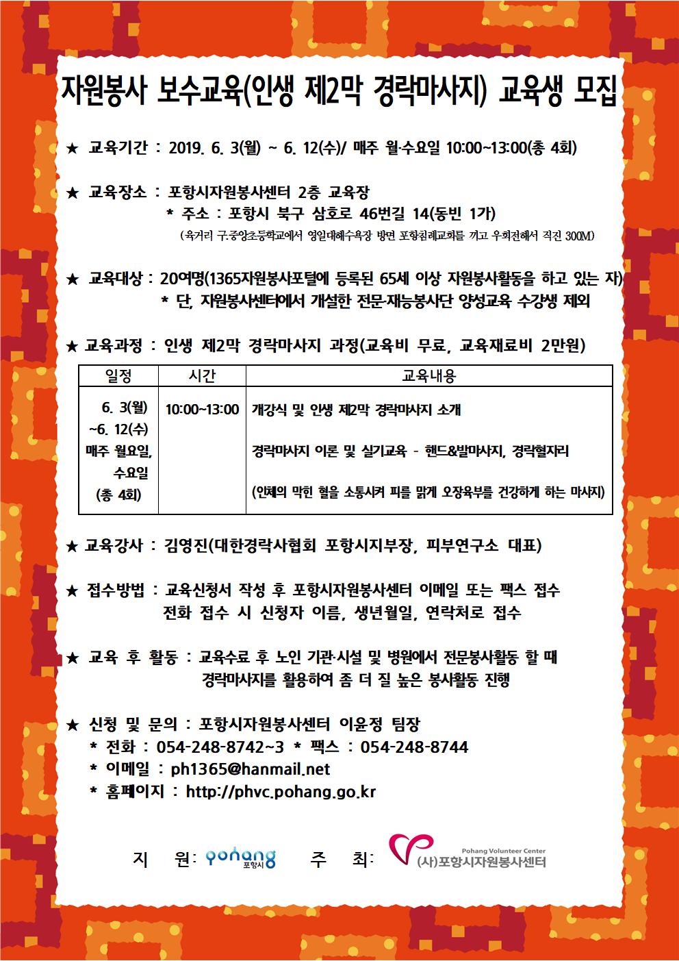 | [모집] 2019 자원봉사 보수교육(인생 제2막 경락마사지 과정) - 65세 이상 | |||
