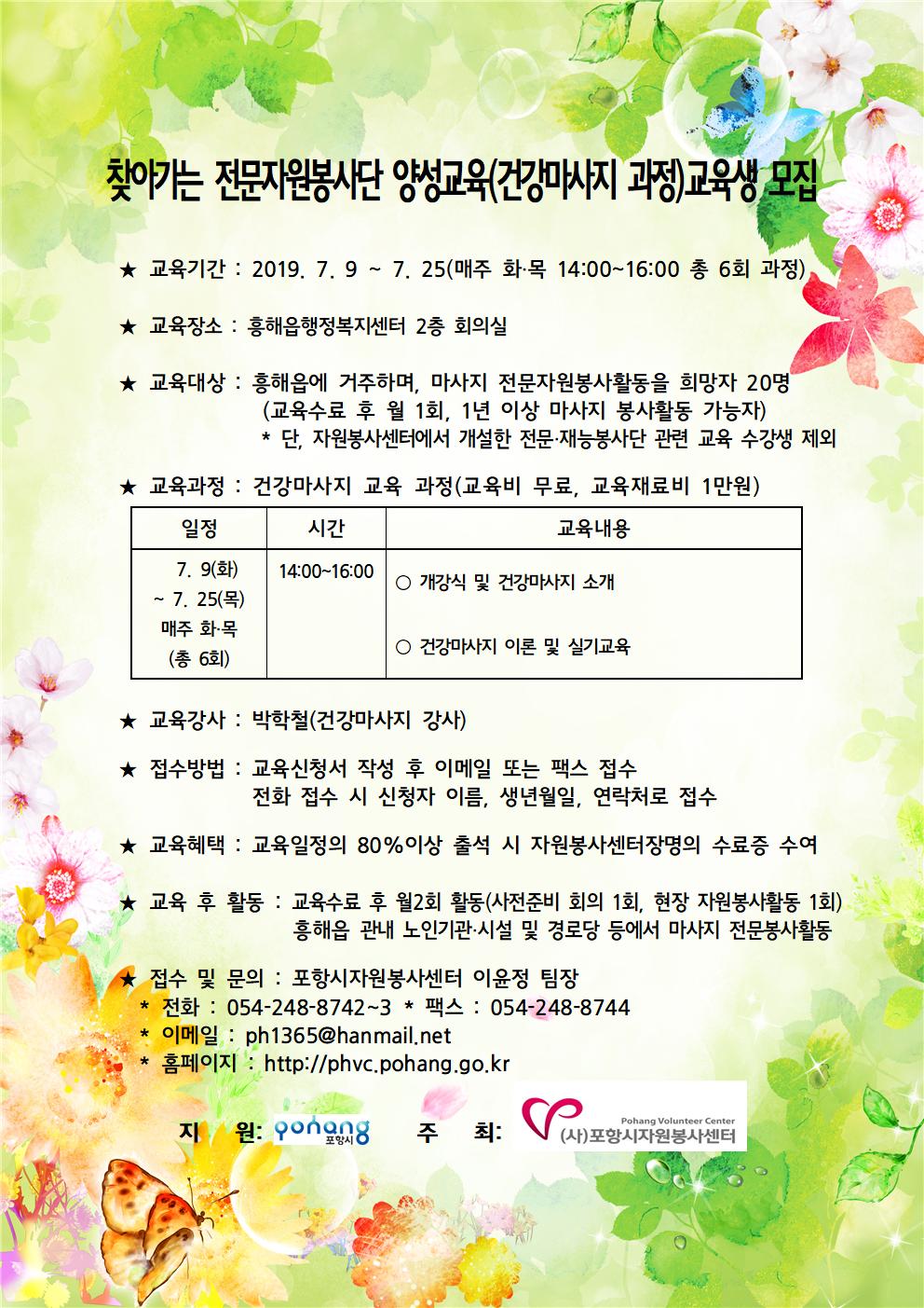 | [모집] 찾아가는 전문자원봉사단 양성교육 - 건강마사지 과정(흥해읍) 교육생 | |||