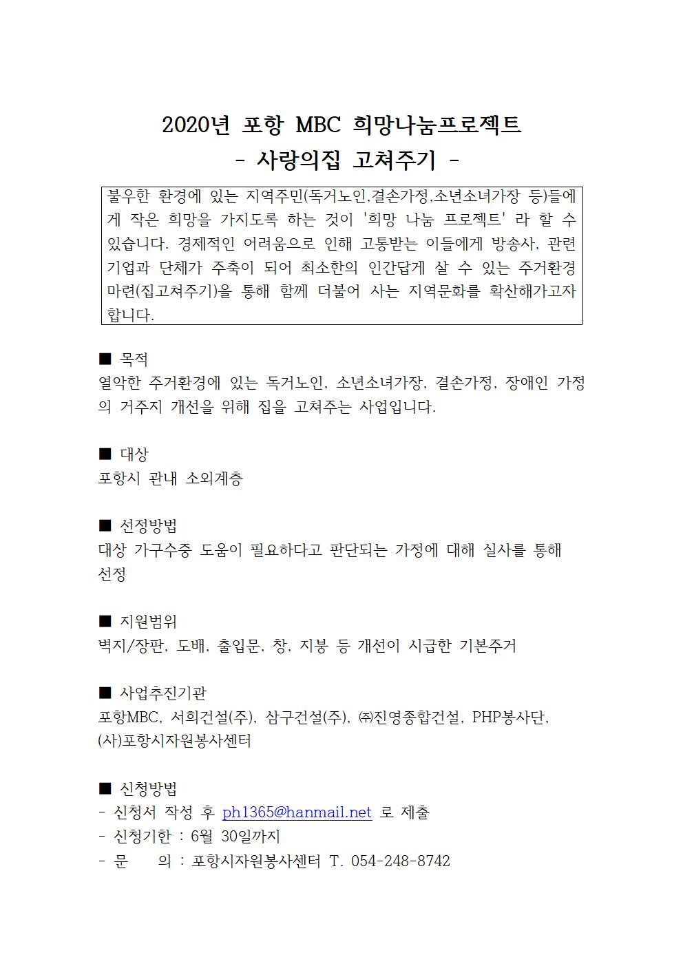 | [공지] 2020년 포항MBC희망나눔프로젝트 - 사랑의 집 고쳐주기 | |||
