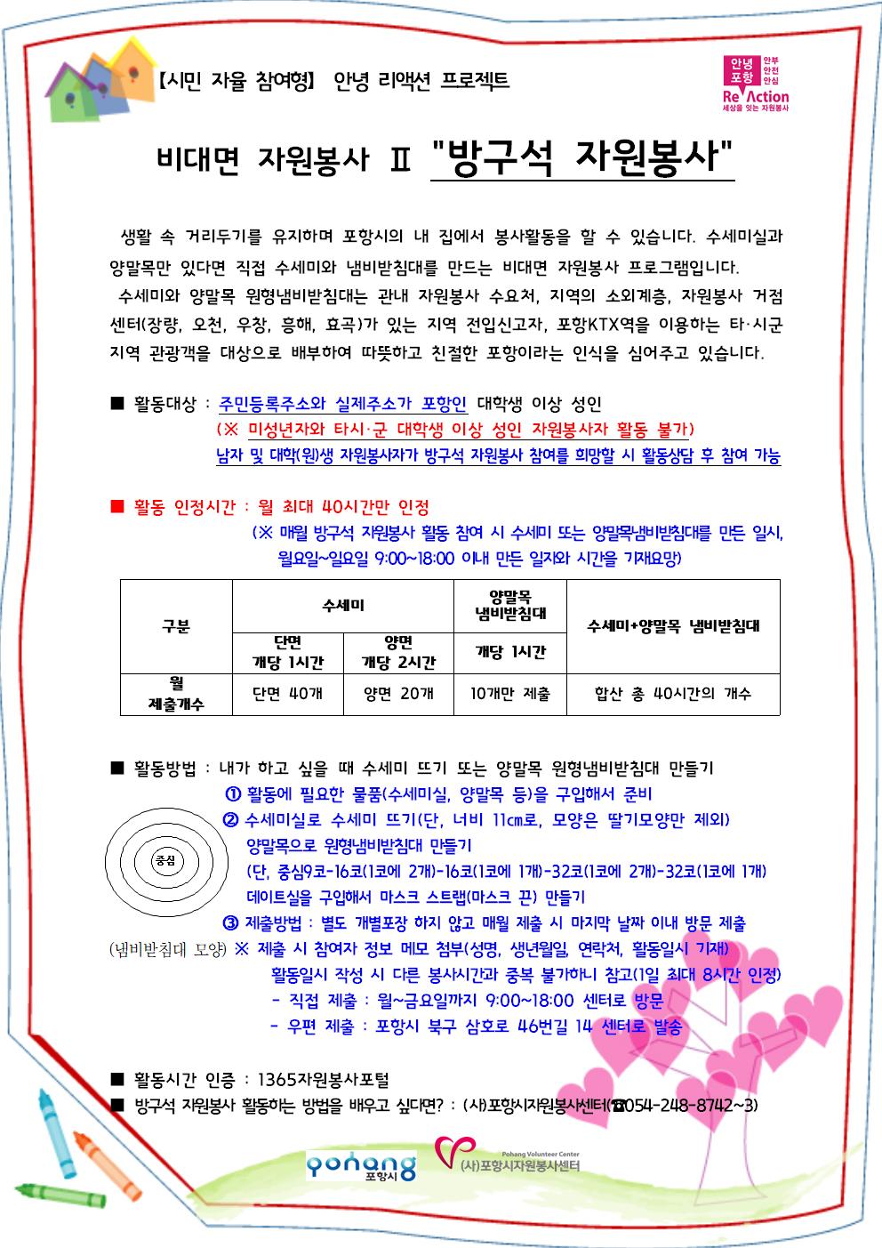 대학(원)생의 이 방구석 자원봉사활동의 참여를 희망하는 경우 반드시 포항시자원봉사센터로 문의를 부탁드립니다.