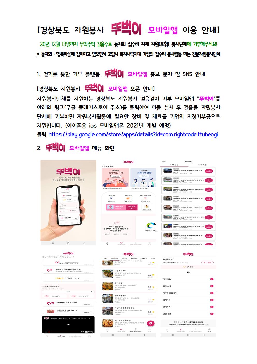 자원봉사 뚜벅이 모바일앱이 개시되었습니다. 경상북도종합자원봉사센터에 개발하였으며, 걷기를 통한 걸음수를 기부하는 기부 플랫폼입니다. ---경북 포항시 자원봉사자분들 덕분에 포항은 기부 100% 달성하였습니다. 12월 13일까지 참여하신 걸음수는 경북 내 다른 지역으로 자율기부를 부탁드릴께요^^