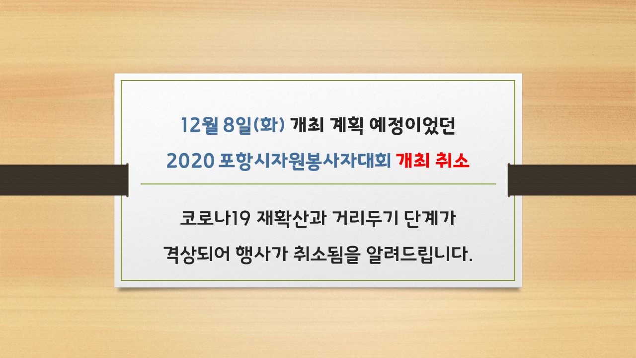 2020년 한해동안 코로나19 상황 속에서도 일상의 연대를 위해 협력하고 소통을 하기 위해 애써주신 자원봉사자 여러분 한 해동안 수고 많으셨습니다. 12월 8일(화) 포항시청 문화동 대잠홀에서 개최예정이었던 포항시자원봉사자대회가 코로나19 재확산과 사회적 거리두기 단계가 격상한 관계로 행사가 취소되었음을 알려드리오니 착오없으시길 바랍니다. 2020 자원봉사 유공으로 표창 관련 상신을 해주신 자원봉사자와 단체 상은 제작이 되면 수상자분께 별도 연락을 드려서 수령하실 수 있도록 안내할 예정이니 참고해주시기 바랍니다. 일상 속의 마스크 착용과 사회적 거리두기, 개인 위생 관리를 보다 철저히 하시어 건강한 연말연시 보내시기를 기원합니다. |