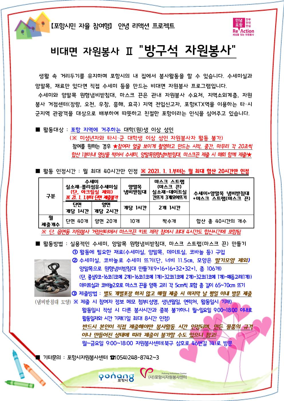 포항시자원봉사센터에서는 코로나19상황에서도 자원봉사를 하고 싶은 포항시민을 위해 안전하게 생활 속 사회적 거리두기를 실천하며 할 수 있는 비대면 자원봉사 프로그램 <방구석 자원봉사>를 진행하고 있습니다. 21년부터 방구석 봉사활동 인정되는 제출 개수와 시간, 활동방법이 조금 변경되었기에 꼭 활동 전에 전반적으로 확인하고 앞으로 많은 관심과 참여를 부탁드립니다. 본 프로그램의 경우, 미성년자와 포항시민이 아닌 타,시군 지역의 자원봉사자는 활동참여가 어려운 점 양해를 부탁드립니다. 만들어서 제출해주신 방구석 자원봉사활동 물품들은 포항시 관내 자원봉사 수요처, 지역소외계층, 자원봉사 거점센터(장량, 오천, 우창, 흥해, 효곡) 지역 전입신고자, 포항KTX역을 이용하는 타시군 지역 관광객을 대상으로 배부하고 있으므로 만들 때 만든 것을 받는 분들을 생각하며 정성스럽게 예쁘게 만들어주면 더욱 감사하겠습니다. 새롭게 바뀐 부분 한번 더 안내합니다! - 수세미, 양말목 원형냄비받침대, 마스크 스트랩(끈) 활동한 본인이 자원봉사센터로 직접 내방 제출 - 본인이 포항시자원봉사센터(포항시 북구 삼호로 46번길 14) 사무실로 제출할 때 매회 활동영상 제출 - 수세미 뜨는 실은 폴리섬유가 섞인 수세미실만 사용해주세요!(아크릴실 불가) - 수세미 모양은 실용적인 모양만 가능합니다.(딸기 모양과 입체형태의 수세미 불가) - 21년부터는 바뀌는 방구석 자원봉사 활동 종류 부분 : 수세미 중 단면 수세미 제출 불가 - 21년부터 방구석 자원봉사활동으로 인정되는 합산 시간은 총 20시간만 인정 |