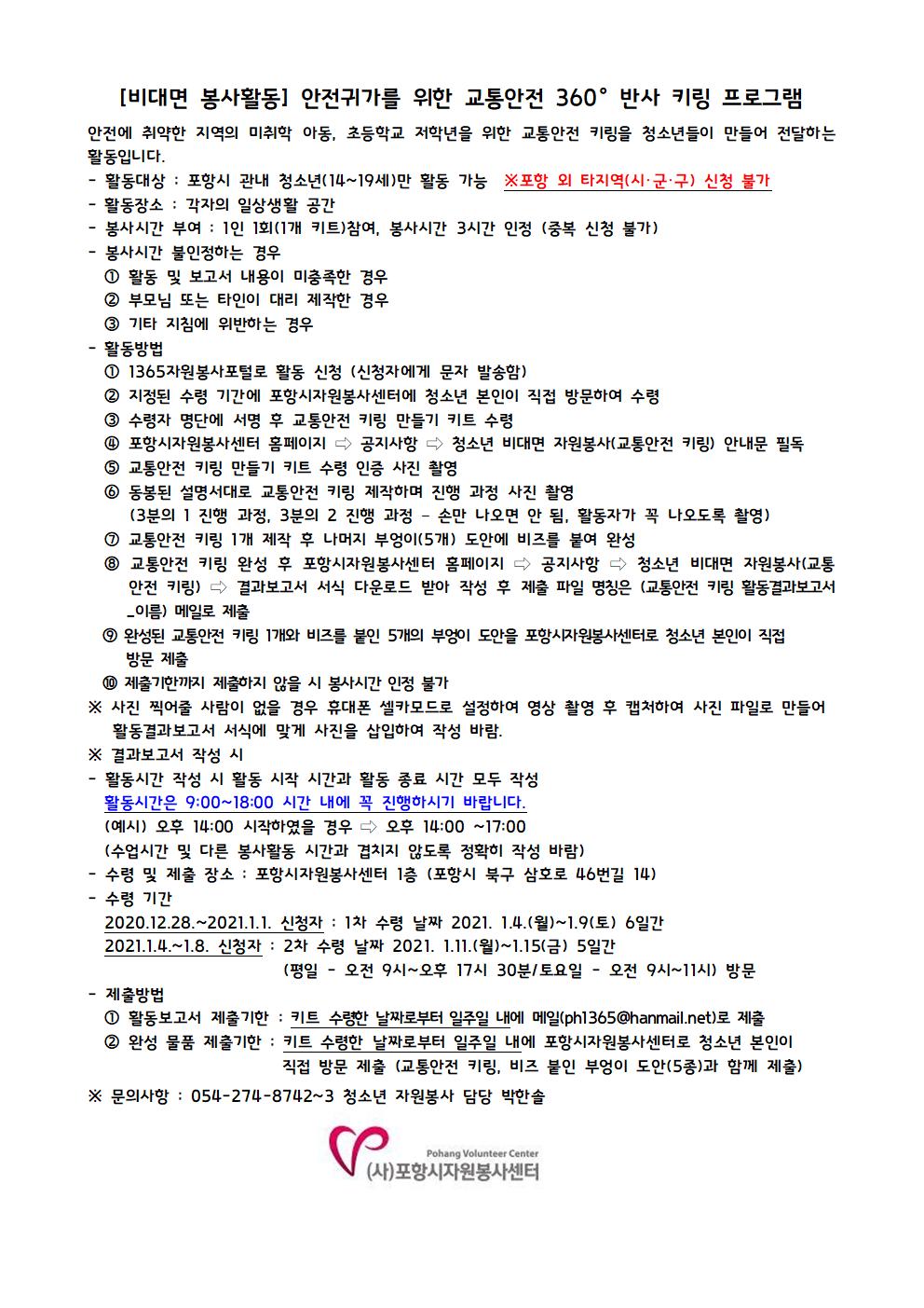 안전에 취약한 지역의 미취학 아동, 초등학교 저학년을 위한 교통안전 키링을 청소년들이 만들어 전달하는 활동입니다. 안전귀가를 위한 교통안전 키링 프로그램 참여자들은 첨부된 서식을 다운받아 활동결과보고서를 작성해서 보내주시면 됩니다. 활동보고서 제출기한 : 키트를 수령한 날짜로부터 일주일 내에 메일(ph1365@hanmail.net)로 제출 제출 파일 명칭은 교통안전 키링 활동결과보고서_이름 입니다. 완성물품 제출기한 : 키트를 수령한 날짜로부터 일주일 내에 청소년 본인이 포항시자원봉사센터로 직접 방문 제출 |