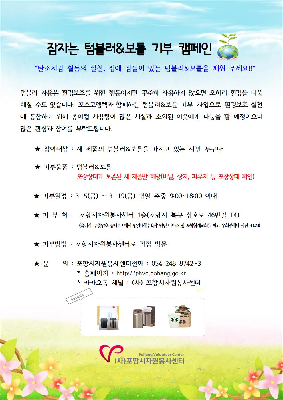 <탄소중립을 위한 탄소저감 활동 프로젝트> 선물 받거나 사은품으로 얻게 된 다회용 텀블러와 보틀이 우리집에 사무실에 잠들어 있다면 의미있는 쓰임인 환경보호실천을 위해 세상 밖으로 꺼내 주세요^^ 본 프로젝트는 포스코엠텍과 함께 합니다! 3월 19일 금요일까지 포항시자원봉사센터로 직접 방문해서 기부해주시면 감사하겠습니다! |