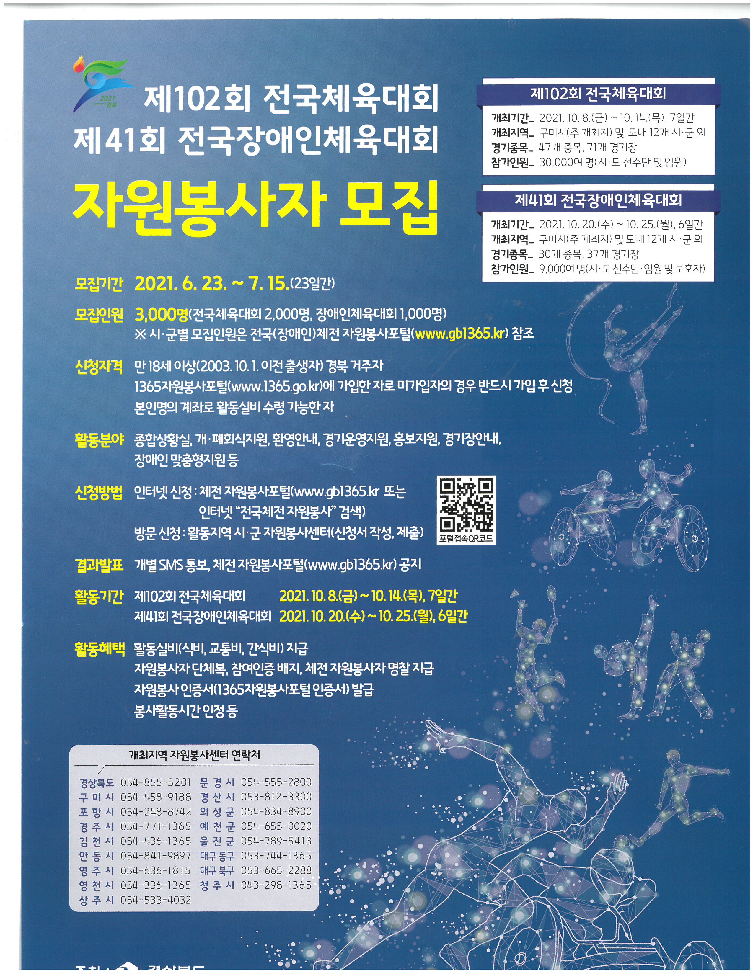 1. 모집기간 : 2021. 6. 23 ~ 7. 15(23일간) 2. 활동기간 : 제 102 회 전국체육대회 : 2021. 10. 8( 금 ) ~ 10. 14( 목 ) / 제 41 회 전국장애인체육대회 : 2021. 10. 20( 수 ) ~ 10. 25( 월 ) 3. 신청자격 : 만18세 이상(2003. 10. 1 이전 출생자) - 경북거주자 1365자원봉사포털에 가입한 자 본인명의 계좌로 활동실비 수령 가능한 자 4. 활동분야 : 안내, 경기 운영지원, 장애인 및 노인 활동지원, 미아보호소 운영 등 5. 신청방법 : 인터넷신청(체전 자원봉사포털 www.gb1365.kr) 또는 방문신청(포항시자원봉사센터 054-248-8742~3) 6. 활동혜택 : 활동실비(급식비, 간식비)지원, 단체복, 참여인증 배치, 자원봉사 인증서, 봉사활동시간 인정 등 7. 문의 : 지역협력팀 신꽃님 팀원(054-248-8742~3) ※ 체전 전 기간 신청 자원봉사자, 단체 단위 신청 자원봉사자 우선 선발, 활동 배치 됩니다. ※ 코로나19 관련 발생현황 및 지역상황에 따라 자원봉사자 모집인원 및 배치인원이 조정될수 있습니다. 이점 양해 바랍니다. |