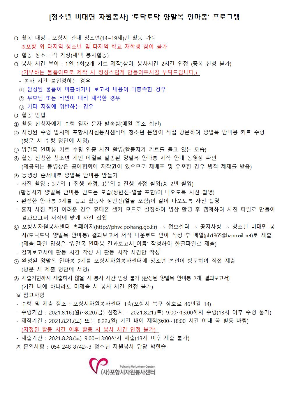 마감 [청소년 비대면 자원봉사] 토닥토닥 양말목 안마봉 프로그램 2차