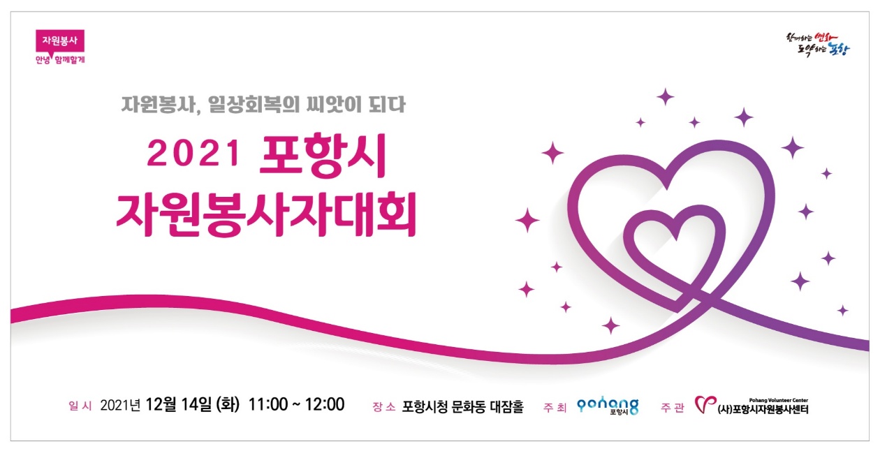 2021년 코로나19로 힘겨웠던 한 해동안에도 지역사회를 위해 나눔과 사랑 실천으로 행복한 포항을 만들어 주신 포항시 자원봉사자분들을 위한 2021 포항시자원봉사자대회가 개최됩니다. 코로나19 확진자가 연일 나오고 있어서 조심스럽지만 2020년에 이어 2021년에도 취소를 하기보다는 본 대회에 수상하시는 분들과 동반1인까지만 참석하여 최소한의 인원만 참석하고 소규모로 진행되는 점 양해를 부탁드립니다. 행사일시 : 12. 14(화) 11:00~12:00(10:40 식전공연) 행사장소 : 포항시청 문화동 대잠홀 주최주관 : 포항시·(사)포항시자원봉사센터