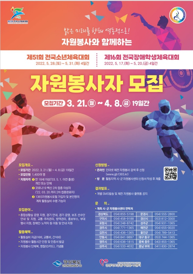 1. 모집기간 : 2022. 3. 21 ~ 4. 8(19일간) 2. 활동기간 : 제16회 전국장애학생체육대회 : 2022. 5. 17(화) ~ 5. 20(금) 4일간 제51회 전국소년체육대회 : 2022. 5. 28(토) ~ 5. 31(화) 4일간