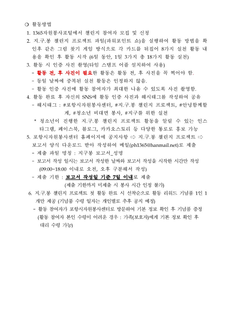 2. 활동안내를 정확하게 읽어보고 활동 부탁드립니다. (활동기준에 맞지 않을 시 봉사 시간 인정 불가)