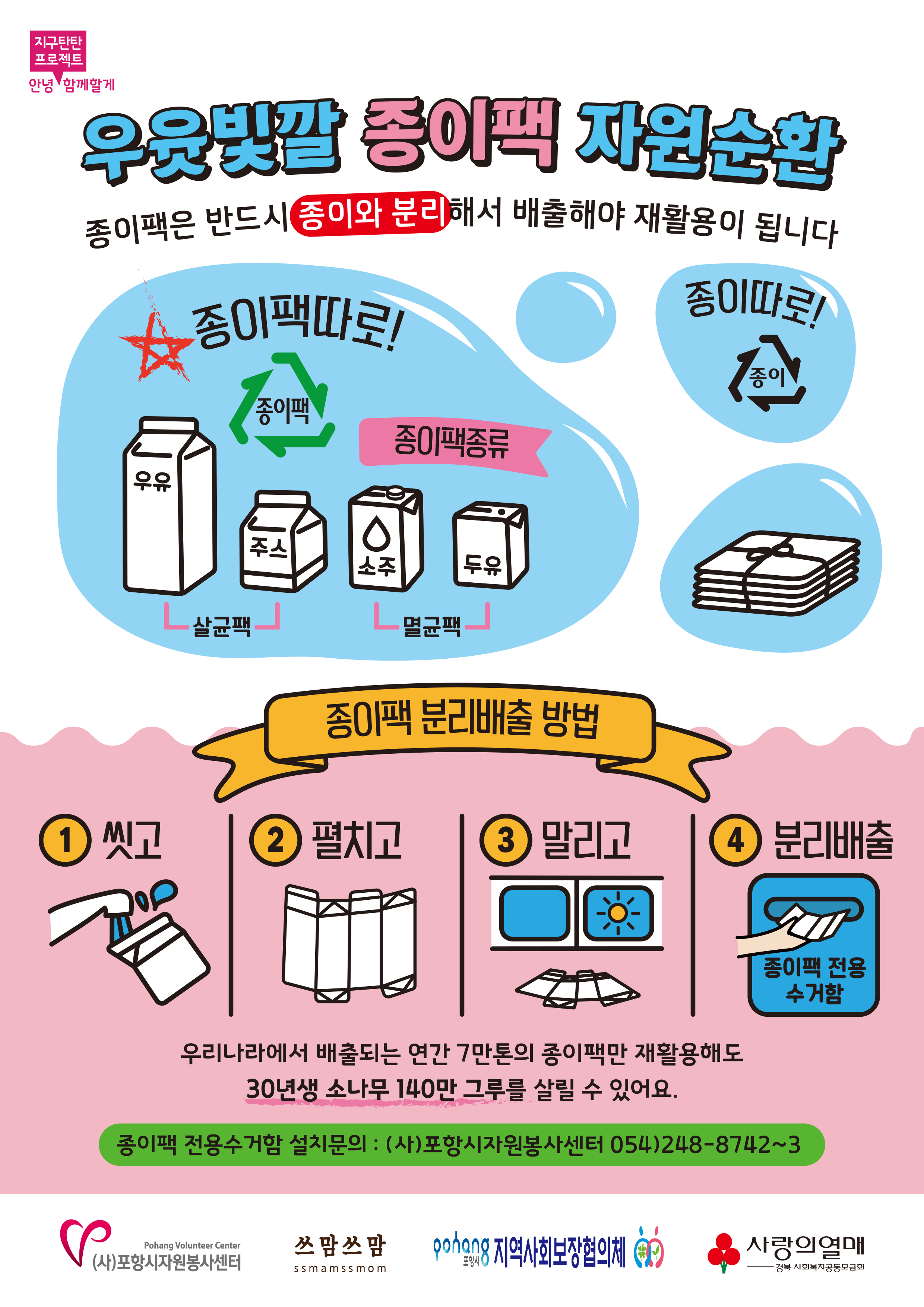 종이팩인 살균팩, 멸균팩을 씻고-펼치고-말리고-종이팩 전용수거함에 분리배출하는 지구를 위한 탄소중립&탄탄한 실천 프로젝트 중 우윳빛깔 종이팩 자원순환 참여에 관심있는 어린이집, 유치원, 학교, 기관과 시설에서 관심과 참여 부탁드립니다. 신청서 작성 후 꼭 담당자와 사업상담을 통해 진행되오니 참고해주세요~ 담당 : (사)포항시자원봉사센터 이윤정 팀장(☎ 054-248-8742~3) |