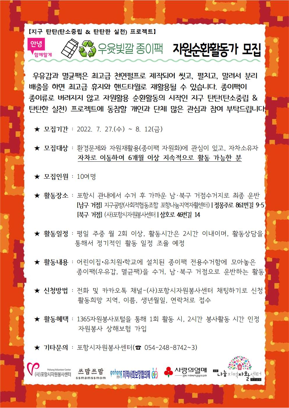 멸균팩(우유갑)과 멸균팩은 최고급 천연펄프로 제작되어 씻고-펼치고-말려서-종이팩 전용수거함에 분리배출을 하면 최고급 원형(둥근)휴지와 핸드타월로 재활용될 수 있습니다. 종이팩이 종이류로 버려지지 않고 자원활용 순환활동의 시작인 지구 탄탄(탄소중립&탄탄한 실천) 프로젝트에 동참할 개인과 단체의 많은 관심과 참여 부탁드립니다! 모집기간 : 2022.7.27(수)~8.12(금) 상담문의 : (사)포항시자원봉사센터 이윤정 팀장(☎ 054-248-8742~3) |