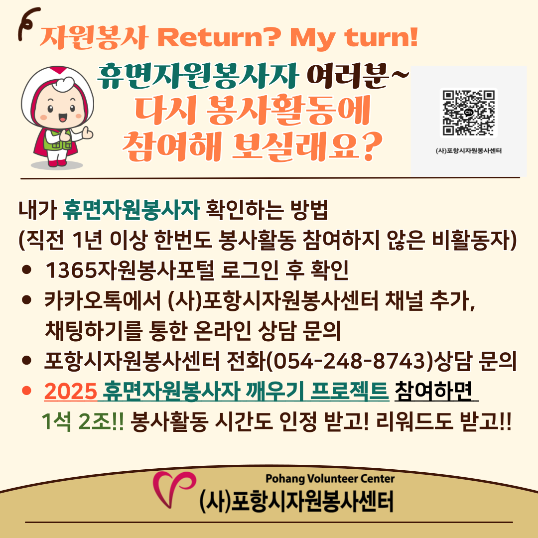 포항시자원봉사센터에서 2025년 휴면자원봉사자 깨우기 봉사활동 프로그램이 시작됩니다. 휴면자원봉사자란? 최근 1년 이상 봉사활동을 잠시 멈춘 분을 말합니다. 2024년 처음 휴면자원봉사자 깨우기 봉사활동을 시작했는데 2025년에도 계속 이어서 프로그램을 진행합니다. 2025년 다시 한번, 잠깐 시간을 내서 봉사활동을 해보면 어떨까요? 휴면자원봉사자 깨우기 프로그램 사전 신청하고, 신청일에 활동 참여 후 소정의 참여 선물도 받아 보세요^^ 곧 포항시자원봉사센터에서 휴면자원봉사자분들 대상으로 프로그램 홍보 문자 메세지를 발송할 예정인데 문자를 받지 못했더라도 휴면자원봉사자로 확인이 되면 본 프로그램에 신청할 수 있습니다. 신청 접수 방법은 신청자 이름, 생년월일, 연락처, 참여 희망 프로그램 일정으로 접수하면 되는데, 2가지 방법이 있으니 좀 더 쉬운 방법으로 접수해주세요. 1. 전화접수(054-248-8742~3) 2. 카카오톡 채널 추가 링크를 통해서 지금 바로 채널추가(https://pf.kakao.com/_DXLxbT) 하고 채팅하기-1:1채팅(https://pf.kakao.com/_DXLxbT) |