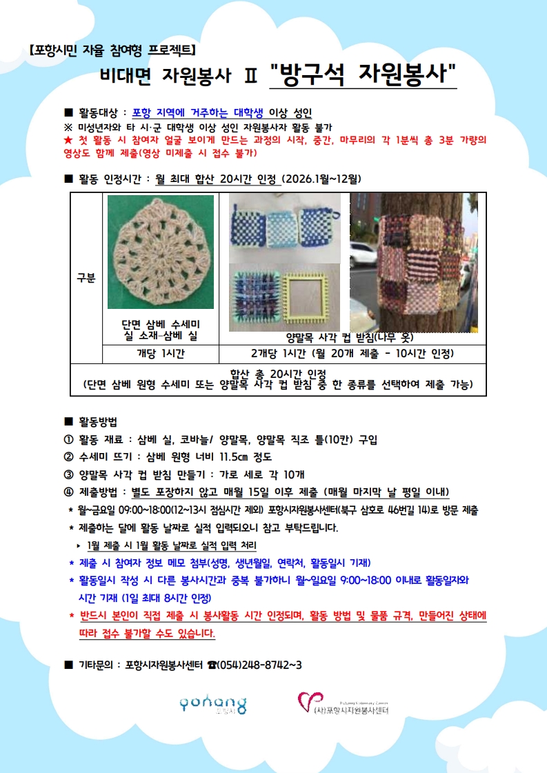 <방구석 자원봉사 : 양말목·수세미 봉사활동 2026년 1월 1일부터 시행하는 활동인정기준 변경 운영 안내> 양말목 사각 컵 받침이 40개 제출에서 20개 제출까지로 활동인정기준이 변경됩니다. 제출방법은 센터에 방문하여 단면 삼베수세미와 양말목 사각 컵 받침 제출 시 활동자 본인이 만드는 영상 함께 제출하십시오. (시작, 중간, 마무리 각 1분씩 합산 3분 이상 영상 촬영) 제출하는 달에 활동 날짜로 실적 입력되오니 참고 부탁드립니다. ★ 매월 15일 이후에 삼베 수세미와 양말목 사각 컵 받침 제출 부탁드립니다. ※ 1월 제출 시 1월 활동 날짜로 실적 입력 처리 진행 (예시 : 1월 15일에 제출할 경우 1.1~1.14 기간 중에 날짜 알려주셔야 함) ※ 자세한 사항은 안내문 참고 부탁드립니다. |