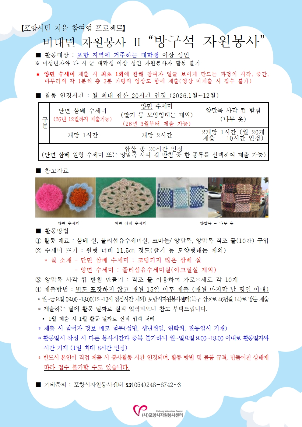 <2026년 3월 3일부터 변경 운영 안내> 비대면 자원봉사 "방구석 자원봉사"는 3월부터 제출 가능 품목으로 양면수세미, 한면 삼베수세미, 양말목 사각 컵 받침 3종으로 변경되었습니다. 자세한 사항은 안내사항을 반드시 확인 후 활동 부탁드리겠습니다. 봉사활동 인정시간은 제출하는 해당 월의 활동 날짜로 실적 입력되오니 참고 부탁드립니다. ★ 모든 품목은 매월 15일 이후에 제출 부탁드립니다. ※ 1월 제출 시 1월 활동 날짜로 실적 입력 처리 진행 (예시 : 1월 15일에 제출할 경우 1.1~1.14 기간 중에 날짜 알려주셔야 함) 문의사항은 포항시자원봉사센터 054)248-8742로 문의 바랍니다. |