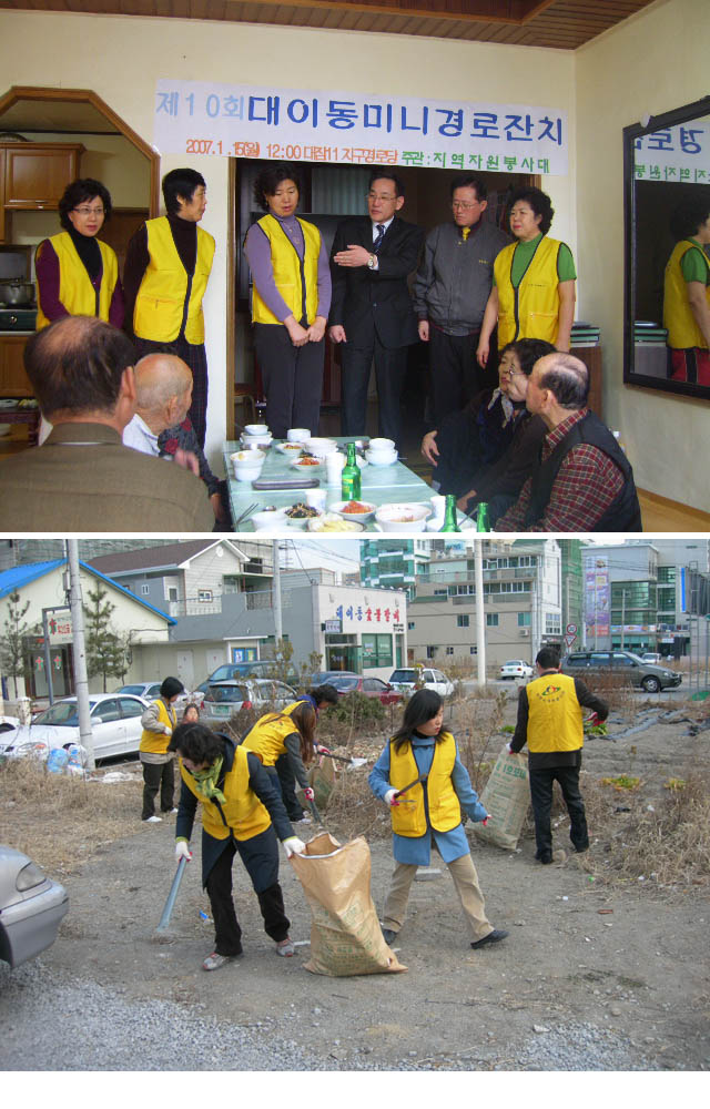 - 대잠11지구 경로당 미니경로잔치 개최하여 떡과 과일 등을 대접하고 식사보조 및 설거지를 하였습니다. ㅇ 2007.1.24일 대이동지역자원봉사대 - 대이동 관내 공한지 및 취약지역 청소 및 폐비닐 수거하였습니다. 지역자원봉사대여러분 수고하셨습니다.~ |