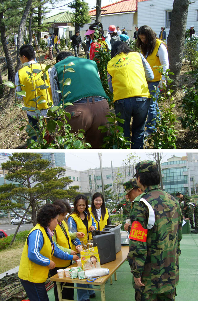 - 활동일시 : 07.1.17 , 07.3.5, 07.4. 5 - 활동내역 : 1월달과 3월달은 설 맞이 및 신청사 개청식 관련 공한지 환경정비및 4월달은 식목행사를 진행하였습니다. 대이동 지역자원봉사대 - 활동일시 : 07.4.11-4.12(양일간) - 활동내역 : 예비군 및 민방위 훈련을 하는 주민들을 위해 대이동 지역자원봉사대 꽃밭가꾸기팀에서 따뜻한 음료(커피, 녹차) 제공하여 주었습니다. 활동해주신 봉사자여러분 수고하셨습니다. |