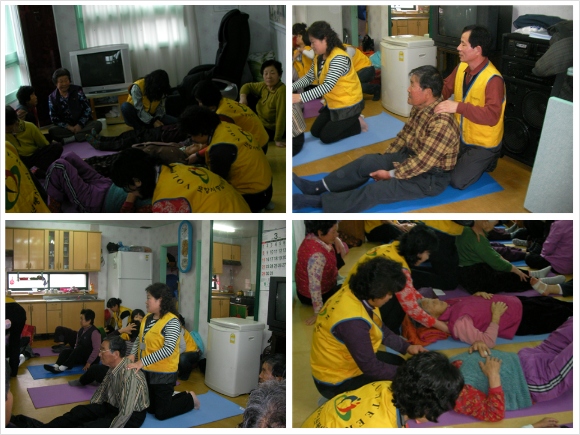 외곽지역인 대보2리마을회관에 찾아가 어르신들께 시원하게 어깨, 다리 등 스포츠마사지를 하면서 말벗서비스를 했습니다. 2008년 11월에 스포츠마사지 전문자원봉사단 양성교육을 통해서 양성된 스마일봉사단 매월 1회 정기적으로 포항시 관내 경로당을 찾아가서 어르신들께 스포츠마사지를 하고 있습니다.