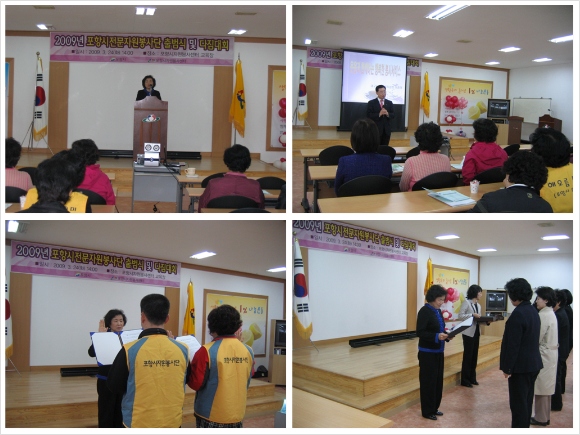 행사일시: 2009. 3. 24(화) 14:00~16:30 행사장소: 센터 2층 교육장 참석대상: 포항시전문자원봉사단 100여명 행사내용: 특강 <웃음과 함께하는 행복한 봉사서비스> 강사: 대구은행 흥해지점 이종태 지점장 포항시전문자원봉사단 선서 포항시전문자원봉사단 단체인증서, 위촉장 수여 포항시전문자원봉사단 소개 많은 전문자원봉사자분들이 참여하셔서 전문자원봉사단 선서를 통해 앞으로 더욱 활발한 전문자원봉사활동을 다짐하고, 단체에 대해서 서로 공유할 수 있는 계기를 마련하는 귀한 시간이었다.