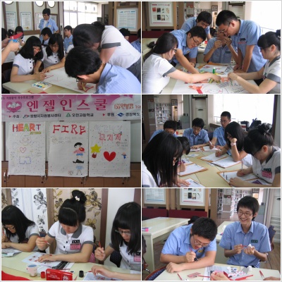 <엔젤인스쿨>프로그램에 참가하는 20여명의 학생들이 모인 가운데 팀빌딩 작업과 페이스페인팅 연습을 했습니다. HEART ATTACK, FIRE, 무지개 팀을 결성하면서 학년간 친분도 쌓고 협동심도 쌓는 기회를 마련하였으며 이후에는 페이스페인팅 연습도 하였답니다.
