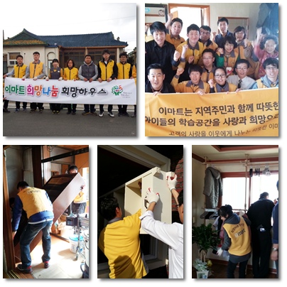포항시자원봉사센터와 MOU체결을 한 E-마트 포항점과 이동점에서는 3월 테마프로그램으로 "희망하우스"를 3월 22일~25일간 실시하였습니다. 포항시 관내에 있는 저소득층 아동집 3곳을 선정하여 아동의 공부방을 꾸며주며, 주변 환경미화를 더불어 실시하였습니다. |