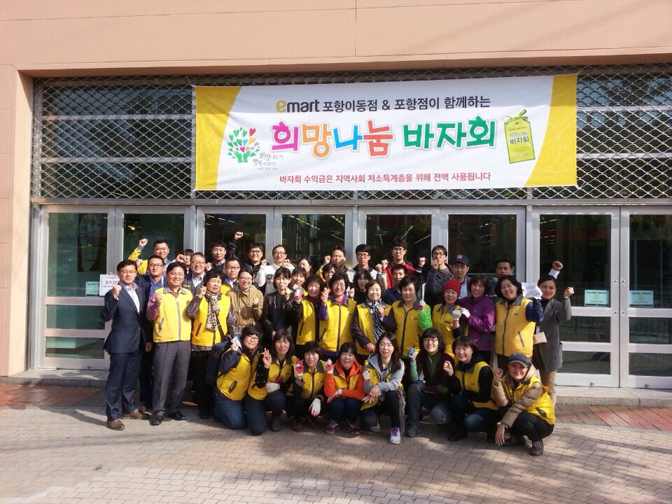 10월 29일(수) 포항시자원봉사센터와 MOU체결한 E-마트에서는 이번 10월 자원봉사 테마를 “ 희망나눔바자회”를 이동점에서 개최하였다. 이날 오전 10시부터 진행 된 바자회에서는 의류, 생활, 문구, 가전 등 각 매장에서 판매되는 상품 약 2천여점(1천만원 상당)이 전시, 판매되었다. 오늘 실시한 “희망나눔바자회”는 2012년부터 실시하여 6번째 실시하는 것으로 활동장소를 이마트 이동점 내 행사장에서 실시를 하여 찾는 손님으로 하여금 많은 관심을 얻었으며, 판매하는 상품은 매장에서 판매되는 가격보다 최대 50% 저렴하게 판매를 하였으며, 오늘 실시한 바자회 수익금(3백여만원)은 지역사회 저소득 계층을 위해 전액 사용될 것이다. |
