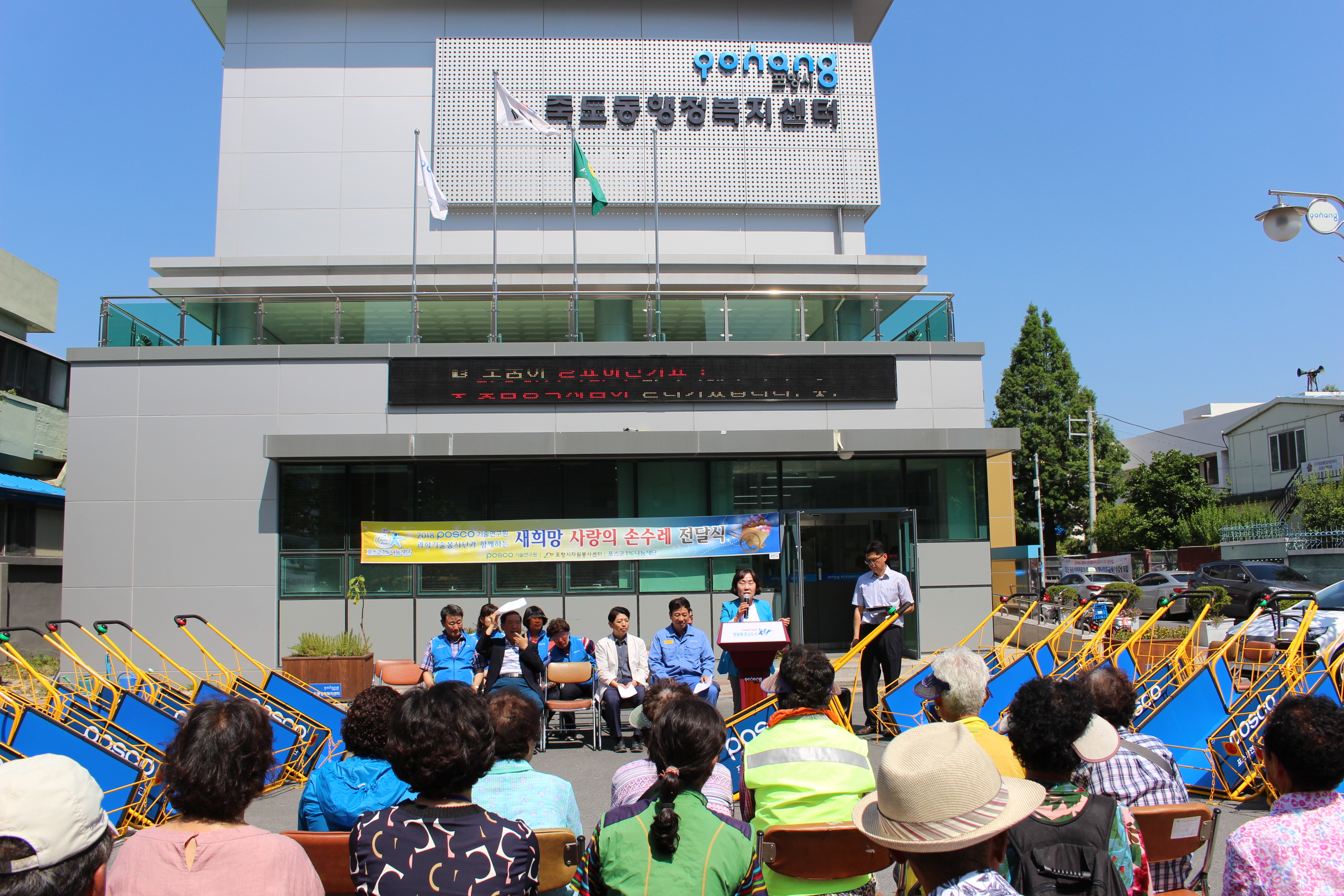 포항시자원봉사센터는 6월21일(목) 죽도동행정복지센터에서 포스코1%나눔재단 지정기탁사업 “새희망 사랑의 손수레 전달식”을 가졌다. 사랑의 손수레는 포스코기술연구원(원장 최주) 포항연구소 과학기술봉사단원들이 일과 후 기능 설계, 제작, 성능 실험을 통하여 노인들이 폐품, 폐지 수집 등의 활동 시 안전하고 편리하게 사용할 수 있는 가볍고 다양한 기능을 갖춘 사랑의 손수레 19대를 제작하여 전달식을 가졌다. 사랑의 손수레는 각종 사고 위험에 노출돼 있는 노인들이 안전하게 폐지를 수집할 수 있도록 기존 리어커 대비 2/3정도의 크기와 경량화 하였다. |