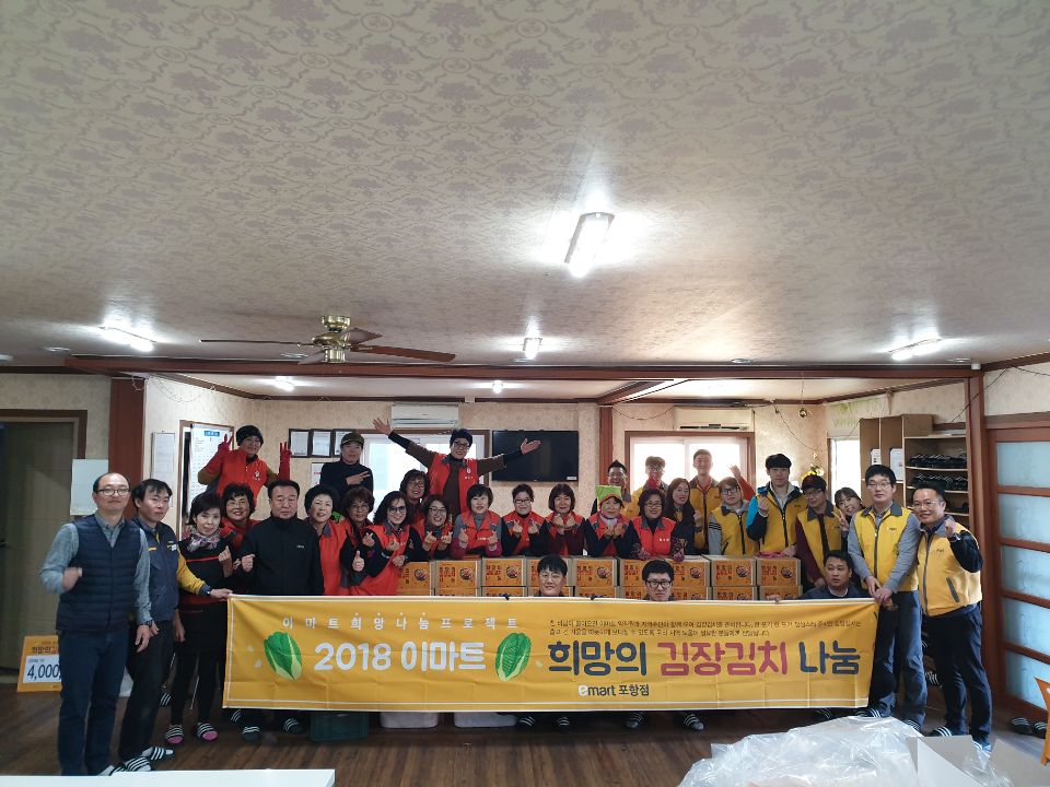 포항시자원봉사센터의 업무지원으로 이마트 포항점(점장 이건호)에서 주관하여 "2018 희망의 김장김치 나눔"을 진행하였다. 오천읍자원봉사거점센터 자원봉사자, 아름다운동행과 함께 30여명이 배수 320통의 속을 버무려 포장과 배달을 진행하였다. |