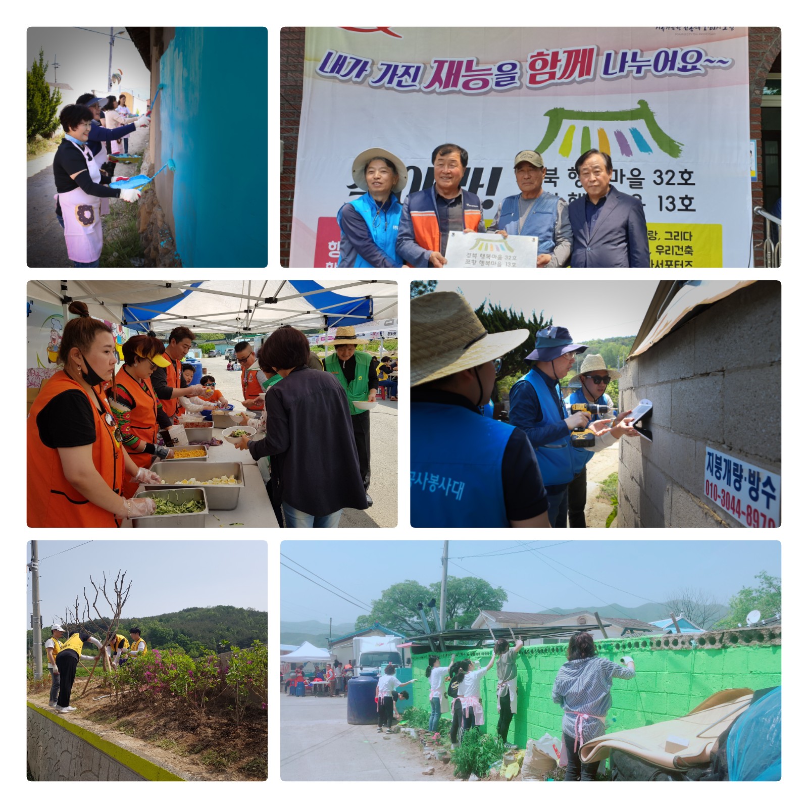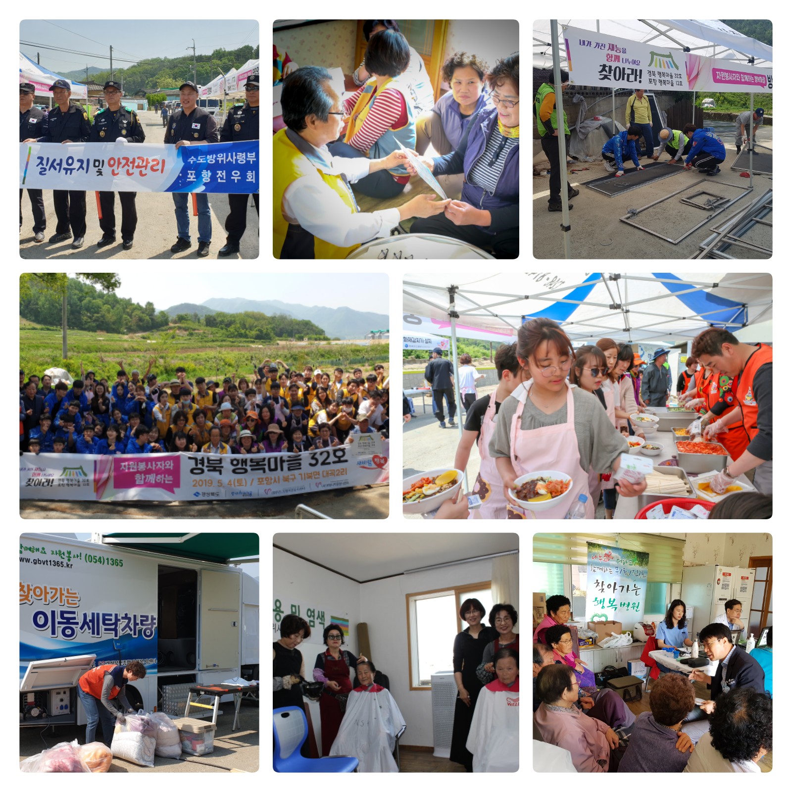 일 자 : 2019. 5. 4.(토) 장 소 : 경북 포항시 기북면 대곡2리 일원 주최 / 주관 : 경상북도종합자원봉사센터, 포항시자원봉사센터 참여인원 : 약 260명(관계자 및 자원봉사자 180, 마을주민 80) 주요내용 - 주거환경 개선(태양광 LED 벽부등 설치(20개), 화재감지기 설치(83개), 화단조성, 마을회관·담장 페인팅(200M), 마을회관 업소용싱크대 설치(2개), 벽체보수작업, 정자 오일스테인(2개소), 방충망교체, 고압세척기 청소 작업(100m) 등) - 생활서비스 제공(기초적인 의료지원, 건강검진, 이·미용 및 염색, 돋보기나눔, 중식나눔, 다과지원, 질서유지 및 안전관리, 이동세탁 서비스, 봉사활동 취재 등) |