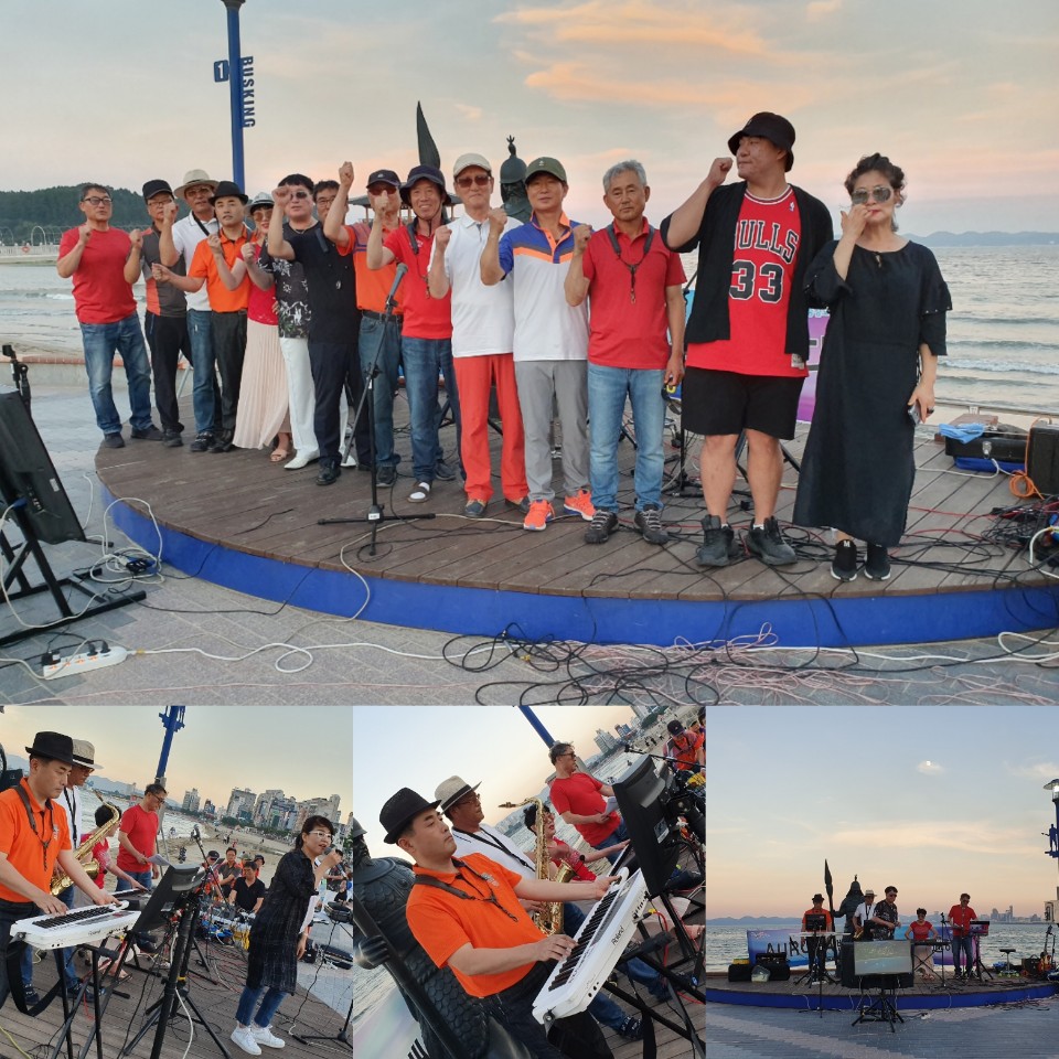 8월12일(월) 저녁7시가 되니..영일대해상누각 옆 1번 버스킹무대에서 만날수 있었던 오로라밴드(단장 신창문)는 공연을 준비하고 있었다. |