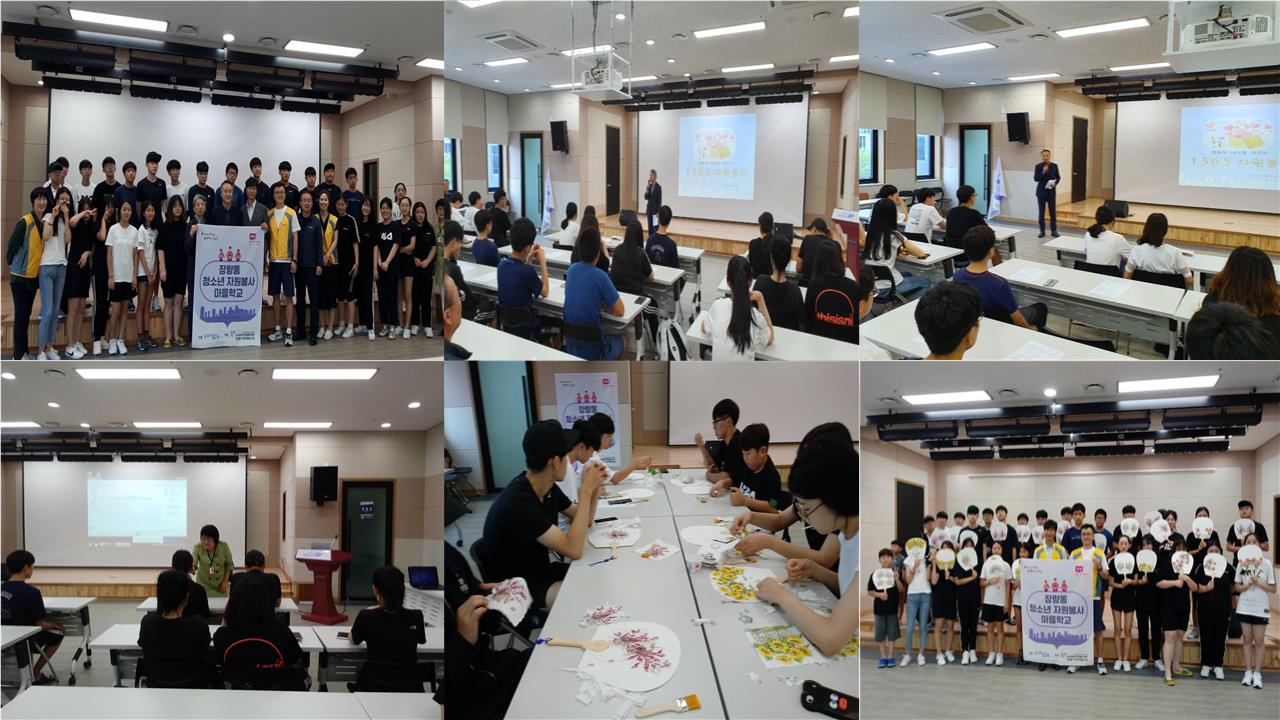 장량동 청소년 자원봉사 마을학교 일시 : 2019. 7.24~26 (14:00~17:00) 3 일간 장량동행정복지센터에서 자원봉사 기초교육 , 심폐 소생술 , 장애인식개선교육, 냅킨아트 부채 만들기, 천연염색손수건 만들기 ,요양병원 방문활동을 실시하였습니다 . |