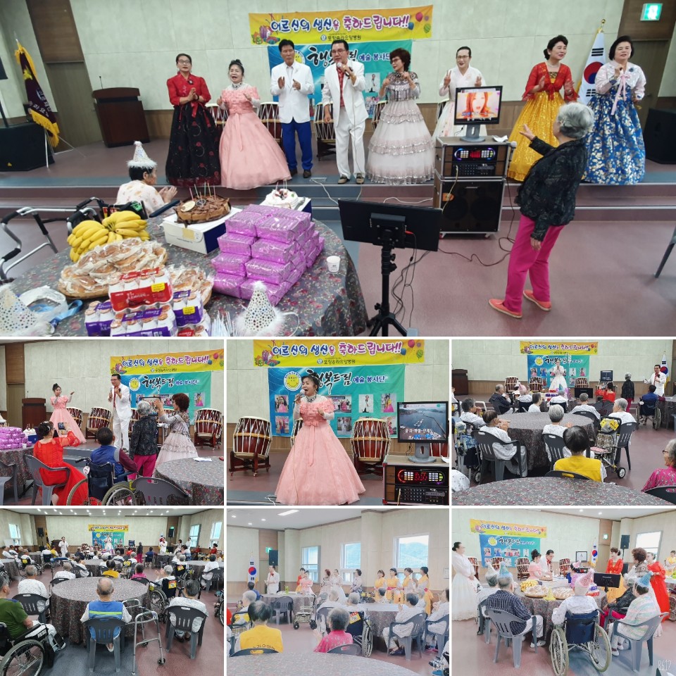 19. 09. 04(수) 행복드림예술봉사단(단장 장주희)는 포항시 북구 송라면에 위치한 포항송라요양병원에 방문을 하여 9월의 생신을 맞으신 20여명의 어르신들의 생신잔치와 더불어 추석맞이 위문공연 봉사활동을 펼치며, 재능나눔을 실천하였다. 이번 공연은 추석 명절을 앞두고 요양원에서 생활하고 계신 어르신들의 외로움을 위로하고 마음에 희망의 온기를 불어놓기 위해 마련되었다. 민요, 가요, 난타등 다양한 공연으로 어르신들은 함박웃음을 보이며 공연시간 내내 즐거움을 함께하였다. 한편 행복드림예술봉사단은 2015년 7월에 포항시자원봉사센터 재능봉사단으로 등록을 하여 매주 포항시 관내에 있는 노인요양시설에 방문을 하여 공연을 통한 재능나눔을 실천하고 있다. |