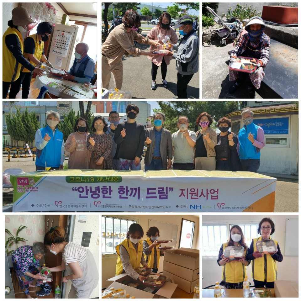 * 포항시자원봉사센터(센터장 권오성)은 NH농협과 한국중앙자원봉사센터(센터장 권미영) 후원으로 코로나19 재난 대응 <안녕한 한끼 드림> 프로그램을 포항위기가정지원센터 무료급식소, 대송면, 연일읍, 동해면지역자원봉사대와 함 께 5.8(금)부터 28일(주말제외)까지 매일 249개의 도시락 나눔을 진행한다. * 본 사업은 코로나19 장기화 및 무료급식소 중단 등으로 취약계층 결식 예방을 위하여 진행되는 사업으로 15일간 3,735인분의 도시락이 노숙인, 독거노인 가정에 전달된다. |