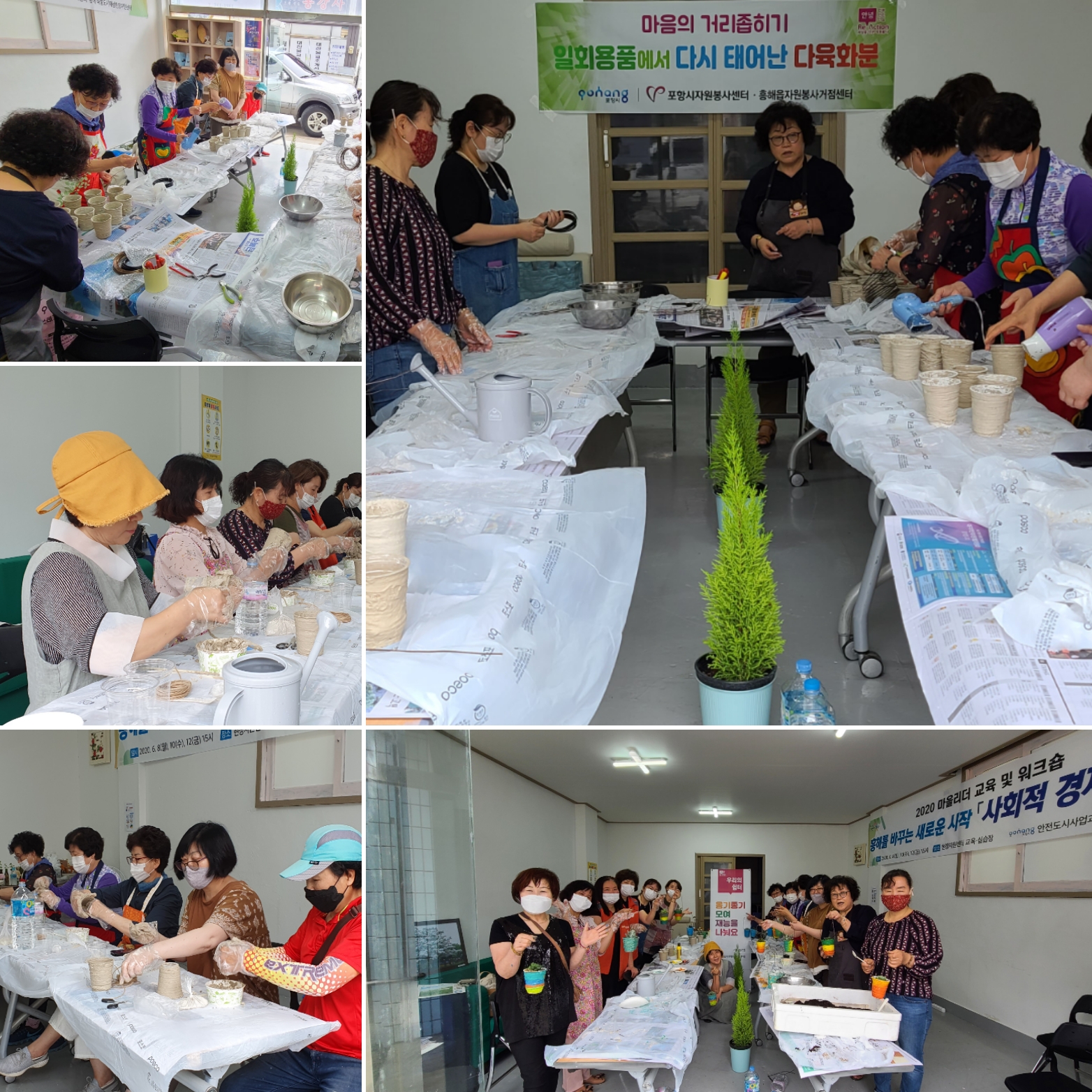 [마음의 거리좁히기] 1+1 일회용품에서 태어난 다육화분 프로그램을 실시하였다. 가. 일 시 : 2020. 7. 3(금) 10:00~12:00 (총2시간) 나. 장 소 : 소통나눔공간(흥해시장 내) 다. 참여대상 : 총18명(재능기부자 김미련 외 2명 / 참여자15명) 라. 재능기부자 : 토탈공예 김미련 강사 외 1명 마. 주요내용 : 자원봉사 기초교육 및 일회용품을 이용한 다육화분 만들기 |