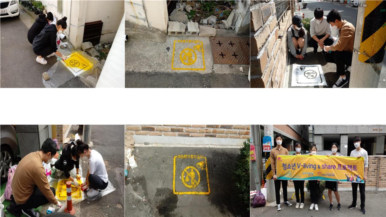 청소년V-living&share 안녕리액션 프로젝트를 진행하였습니다. 활동일시 : 2020년 9월 26일 (토) 10:00~12:00 활동장소 : 죽도동 리치빌, 아슬란 주택 일대 활동대상 : 포항시 관내 청소년 4명, 청년 프로젝트 리더 1명, 직원 1명 활동내용 : 캠페인 픽토그램 황색 스프레이 도색 마킹 활동&환경정화활동 |