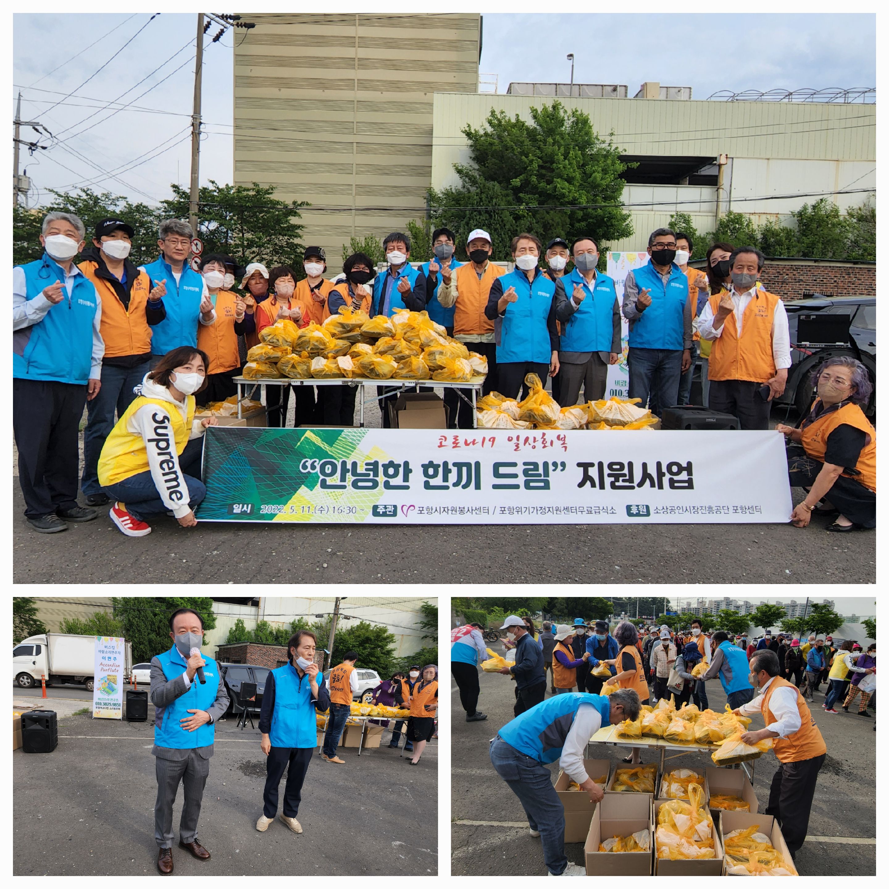 - 일시 : 2022년 5월 11일(수) 16:30 - 활동내용 : 노숙인 및 복지사각지대취약계층 대상으로 도시락 및 두유 200개와 소상공인시장진흥공단 포항센터에서 기증받은 KF94마스크 400개 나눔 활동 진행 - 활동인원 : 법인 임직원 및 재난지킴이봉사단 20여명 - 장소 : 모던하우스 NC포항점 옆 공터 |
