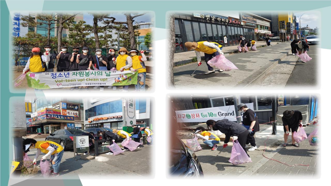 [6월 청소년 자원봉사의 날-두호동 두무치 환경정화활동] • 일 시 : 2022. 6.4.(토) 09:00~11:00 • 장 소 : 두호동 두무치 일대 • 인 원 : 청소년 6명 / 두호동지역자원봉사대 5 명 • 내 용 : 두호동 일대 환경정화활동 |