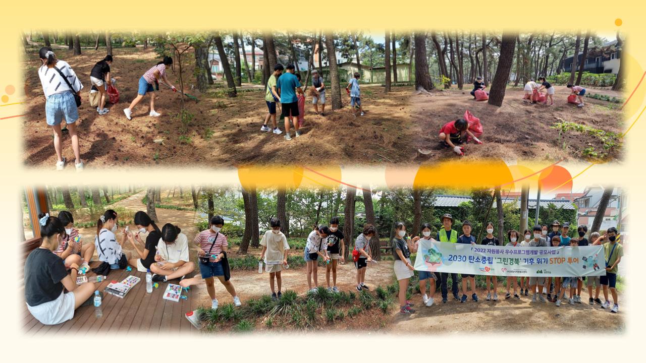 2022 자원봉사 우수프로그램개발 공모사업 [기후 위기 STOP 투어] • 일 시 : 2022. 6.25.(토) 10:00~12:00 • 장 소 : 송도 솔밭 도시숲 • 인 원 : 청소년 14 명 / 경북생명의숲 강사 2명 • 내 용 : 숲 생태계 관련 교육 및 솔숲 가꾸기 활동(솔잎 낙엽 긁기) 진행 |