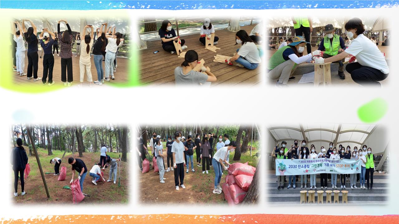 2022 자원봉사 우수프로그램개발 공모사업 [기후 위기 STOP 투어] • 일 시 : 2022. 7.16.(토) 10:00~12:00 • 장 소 : 송도 솔밭 도시숲 • 인 원 : 청소년 18 명 / 경북생명의숲 강사 2명 • 내 용 : 숲 생태계 관련 교육 및 솔숲 가꾸기(솔잎 낙엽 긁기) 및 스툴의자 만들기 활동 진행 |