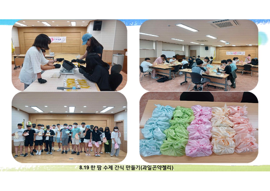 [청소년, 손으로 자봉 ON 프로젝트 -‘한 땀 수제 간식 만들기' 프로그램] • 일 시 : 2023.8월 • 장 소 : 포항시자원봉사센터 2층 교육장 • 내 용 : 1. 자원봉사 기초교육 2. 수제 간식(과일곤약젤리) 만들기 (지역 취약계층 전달) |