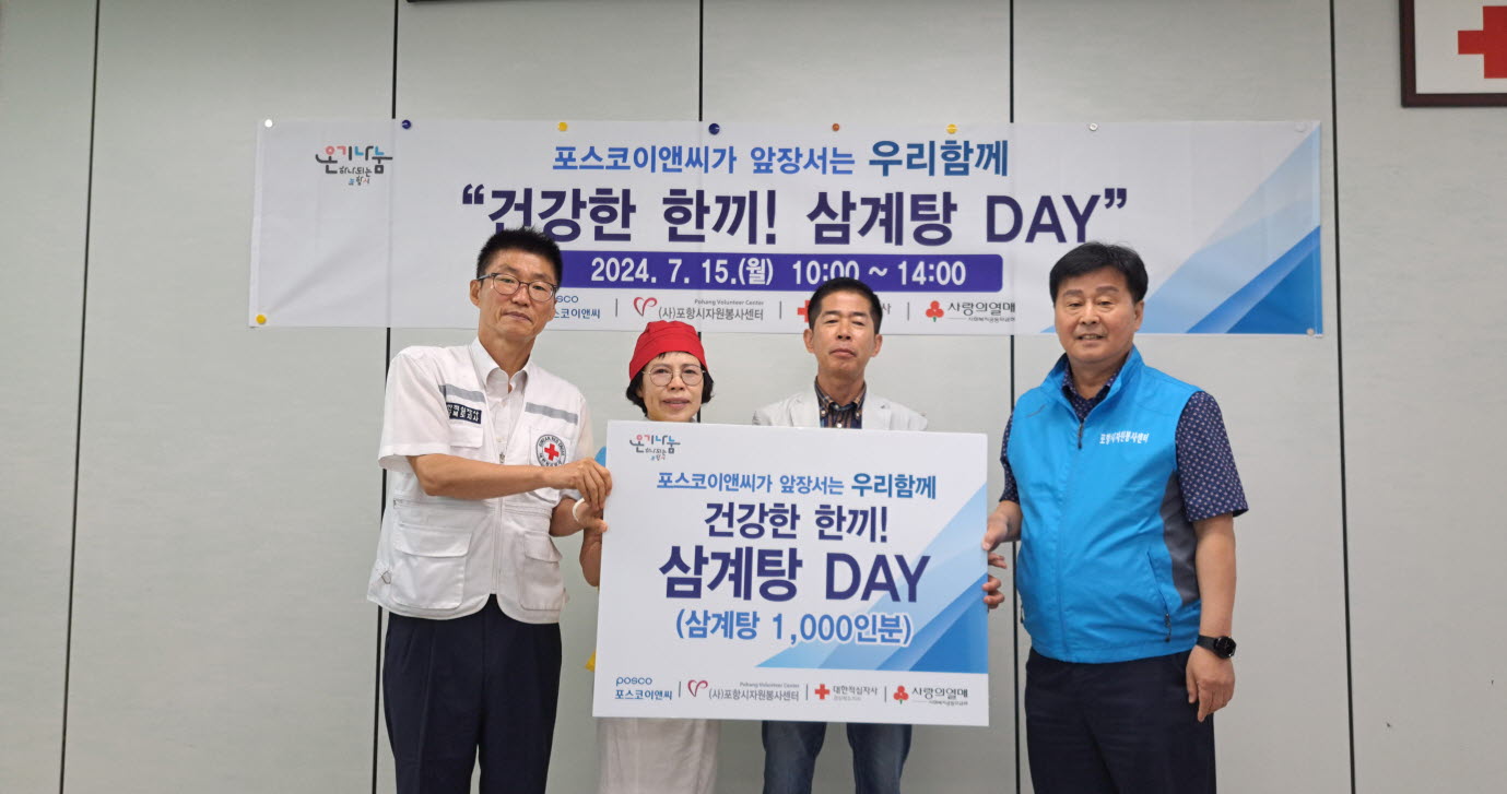 (사)포항시자원봉사센터와 포스코이앤씨는 7월 15일 초복날 대한적십자사 경상북도지사 동부봉사관과 창포종합사회복지관 사랑나눔터, 오천무료급식소, 사랑나눔의집, 청림행복나눔의집 등 5개 무료급식소에서 『포스코이앤씨가 앞장서는 우리함께 - 건강한 한끼! 삼계탕 DAY』를 진행했다. 포스코이앤씨 지정기탁사업인 『건강한 한끼! 삼계탕 DAY』는 사회복지공동모금회 후원사업으로 무더운 여름 날씨 관내 취약계층 이웃을 위해 원기회복에 좋은 삼계탕 건강식 1,000인분을 준비하여 활기찬 여름을 보낼 수 있도록 한 끼를 대접하였다.