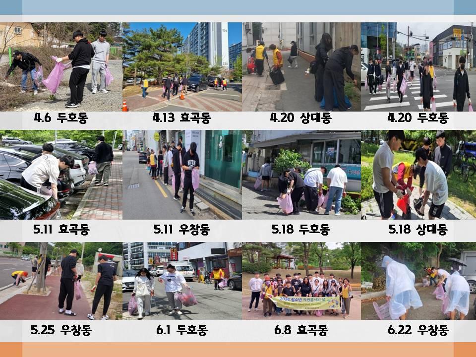 [청소년 자원봉사의 날 – 지역 환경정화활동] * 일 시 : 2024. 4월~6월 * 장 소 : 효곡동, 상대동, 두호동, 우창동 일대 환경정화활동 |