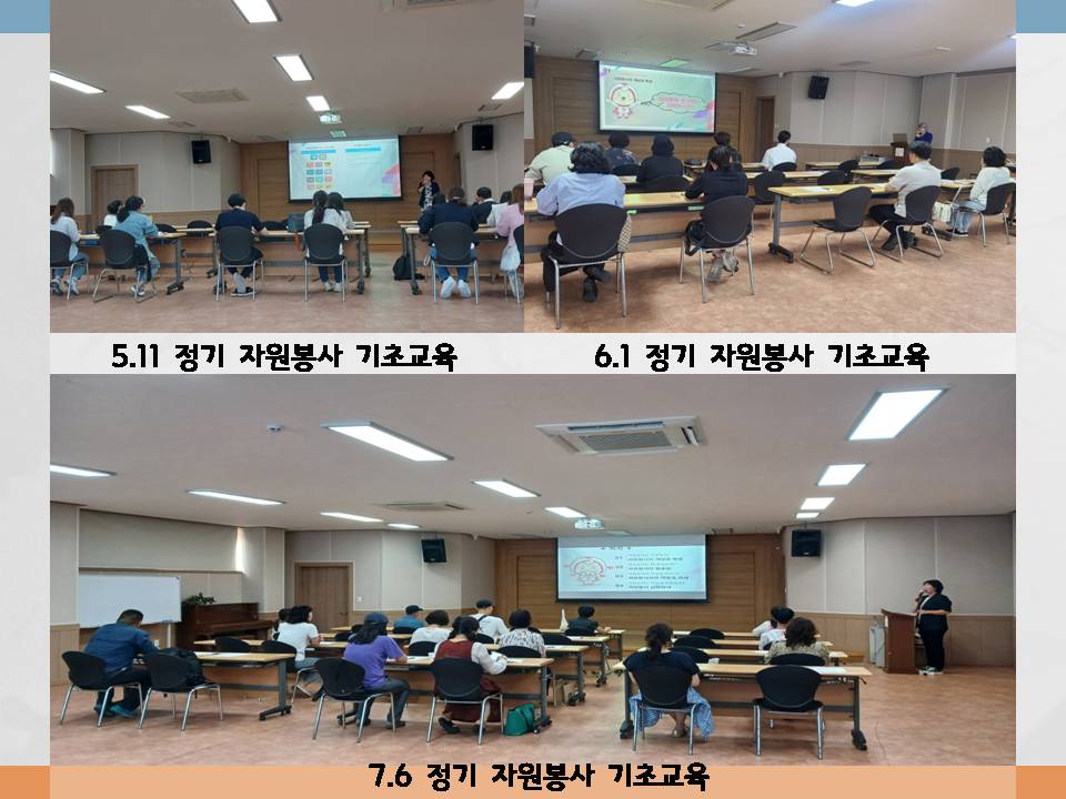 [2024년 정기 자원봉사 기초교육] 교육일시 : 5~7월 매월 첫 번째 주 토요일 10:00~11:00 교육강사 : 자원봉사 교육 강사회(5월-안지현 강사님, 6월-권소영 강사님, 7월-양순남 강사님) |