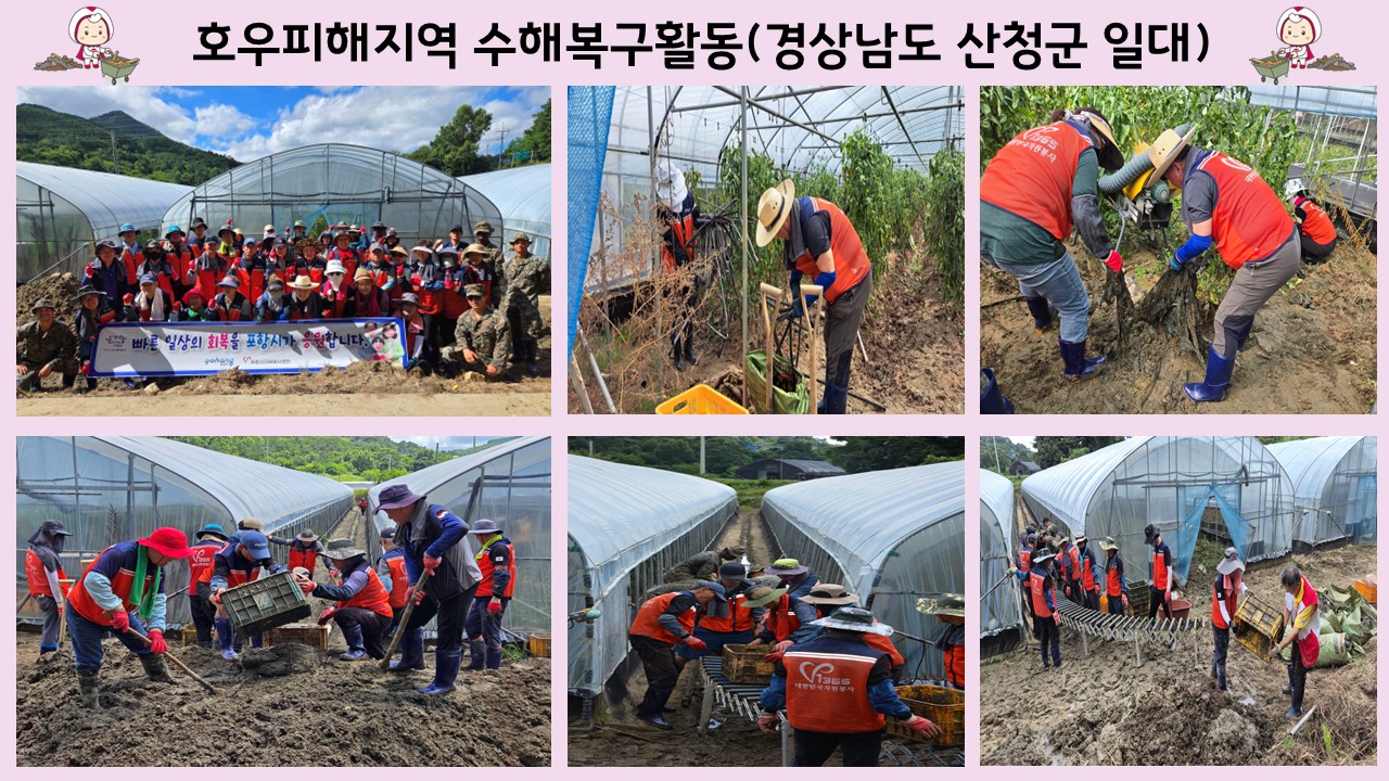 경남 산청군 극한호우 피해지역 복구활동 지원 일시 : 2025년 7월 26일(토) 내용 : 경남 산청군 차황면 장위리 토마토 농가 비닐하우스 토사제거, 농작물 정리 등 피해 복구 활동 지원 |